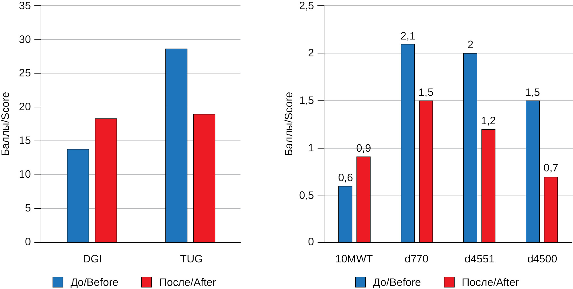 Примечание: DGI — динамический индекс ходьбы; TUG — тест «Встань и иди»; 10MWT — тест 10-метровой ходьбы; b770 — функция стереотипа походки; d4551 — преодоление препятствий; d4500 — ходьба на короткие расстояния.