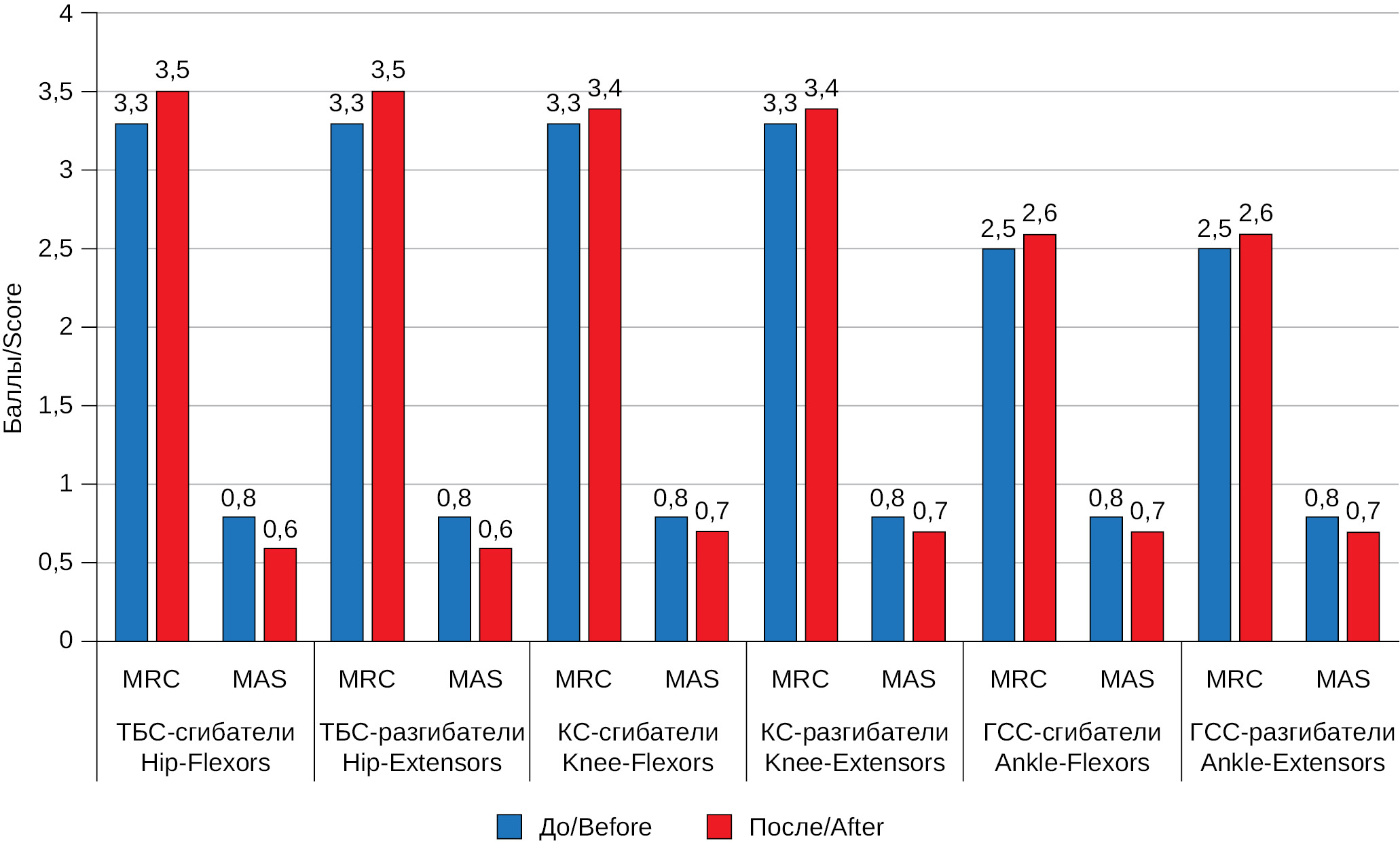 Рис. 4. Результаты исследования по шкале оценки мышечной силы (MRC) и мышечного тонуса (MAS) (средние значения)