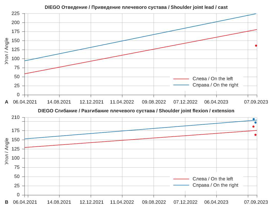 Рис. 1. Динамика объема движений в плечевом суставе в ходе лечения пациента Н.: A — отведение/приведение, B — сгибание/разгибание
