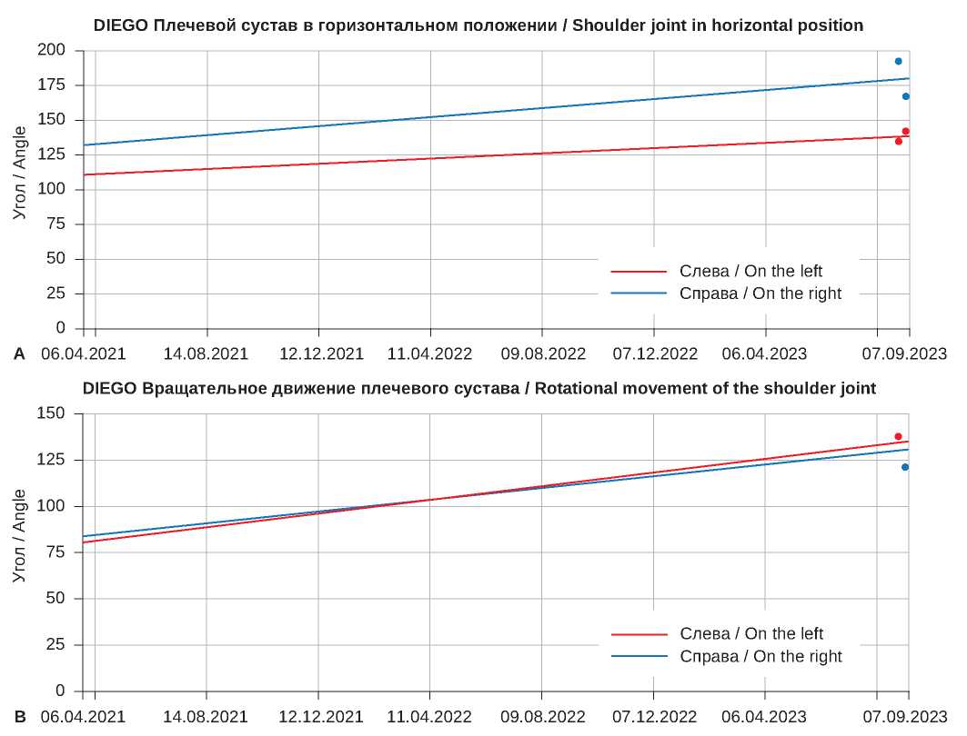 Рис. 2. Динамика объема движений в плечевом суставе в ходе лечения пациента Н.: A — горизонтальное положение, B — вращательное движение