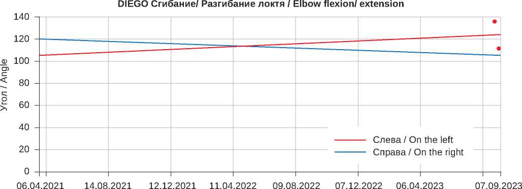 Рис. 3. Динамика объема движений в локтевом суставе (сгибание/разгибание) в ходе лечения пациента Н