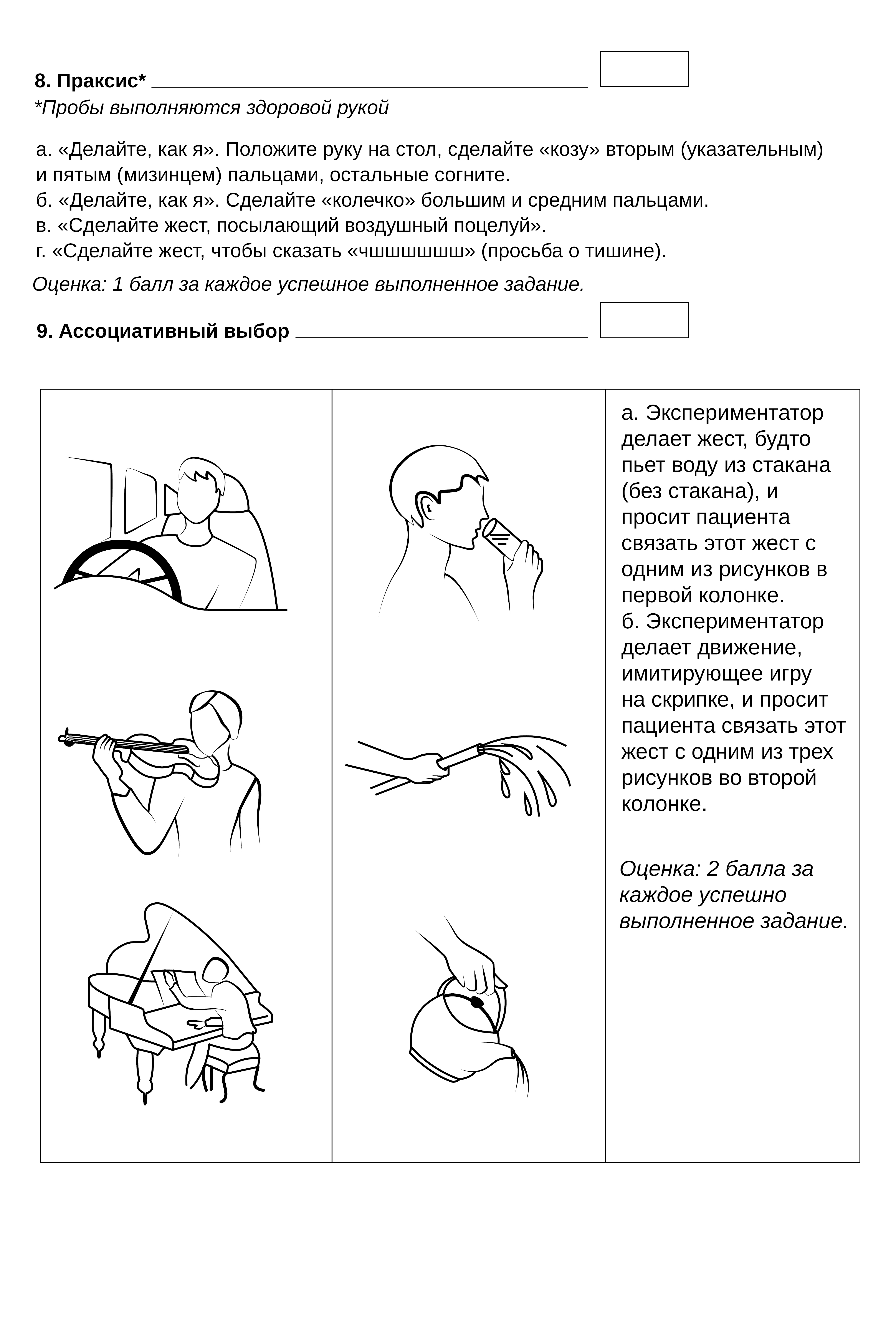 № | Тестовое задание / Test task | Праксис, гнозис, внимание / Praxis, gnosis, attention | Гнозис, мышление, речь, внимание / Gnosis, thinking, speech, attention | Память, социальный интеллект, мышление, внимание / Memory, social intellect, thinking, attention |