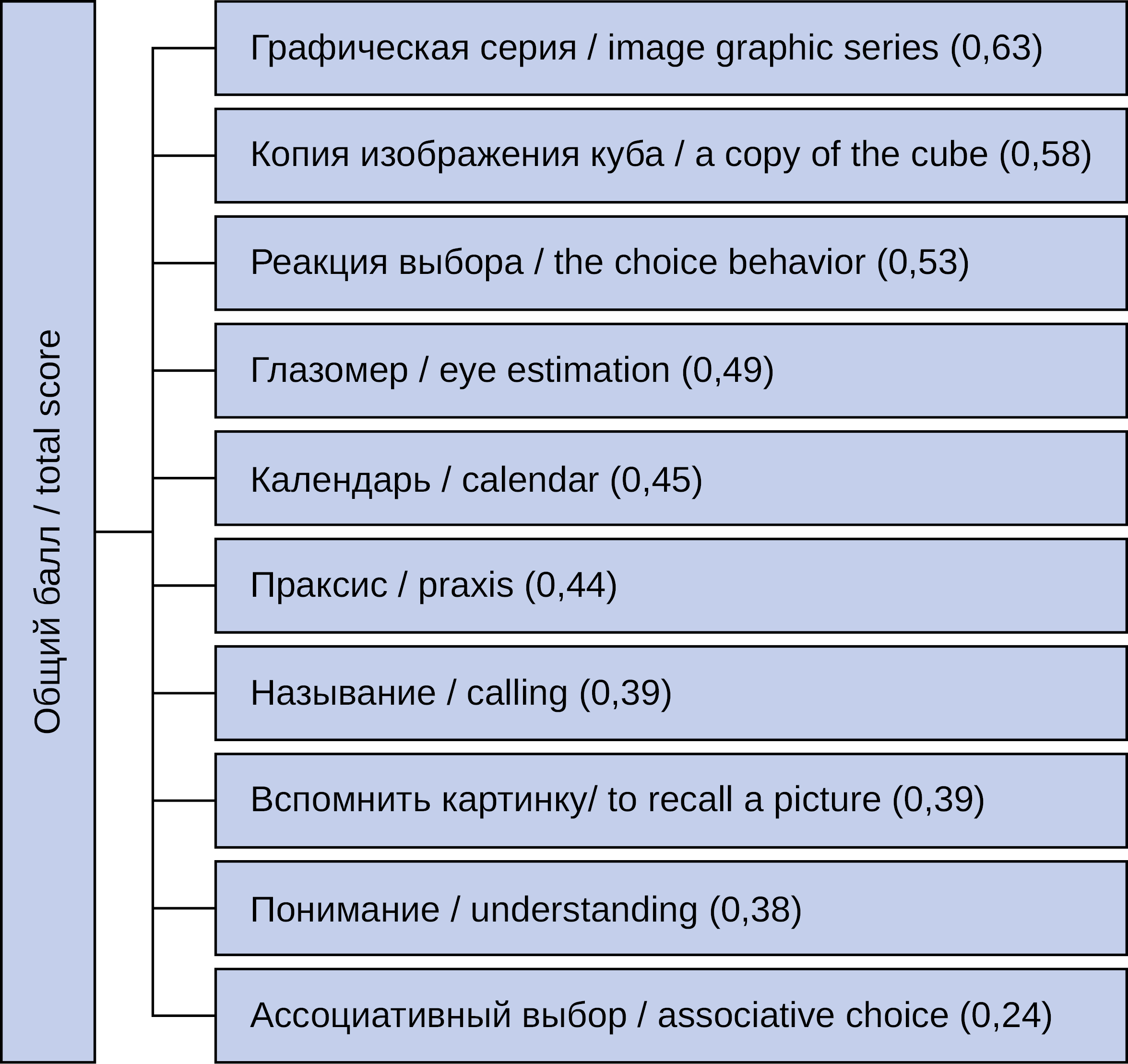 Результаты исследования дискриминативной способности тестовых заданий представлены корреляционной плеядой (рис. 2), отражающей результаты анализа взаимосвязи тестовых заданий стимульного материала апробируемой методики ШКСПИР с ее итоговым баллом. Использовался коэффициент корреляции Спирмена, полученные значения принадлежат промежутку от 0,24 до 0,63, что в целом интерпретируется как положительная связь умеренной силы. Достоверность выявленных закономерностей соответствовала статистической значимости р ≤ 0,001. Наиболее информативными в отношении дискриминации выборки по исследуемому признаку (степень сохранности когнитивных функций) оказались задания на исследование кинетического праксиса («графическая серия» (0,63), «копия изображения куба» (0,58), «реакция выбора» (0,53)); средней информативностью обладают задания на конструктивно-пространственный праксис, память и гнозис («глазомер» (0,49), «календарь» (0,45), «праксис» (0,44)); наименее информативными оказались задания, требующие сохранности речи («называние» (0,39), «вспомнить картинку» (0,39), «понимание» (0,38), «ассоциативный выбор» (0,24)).