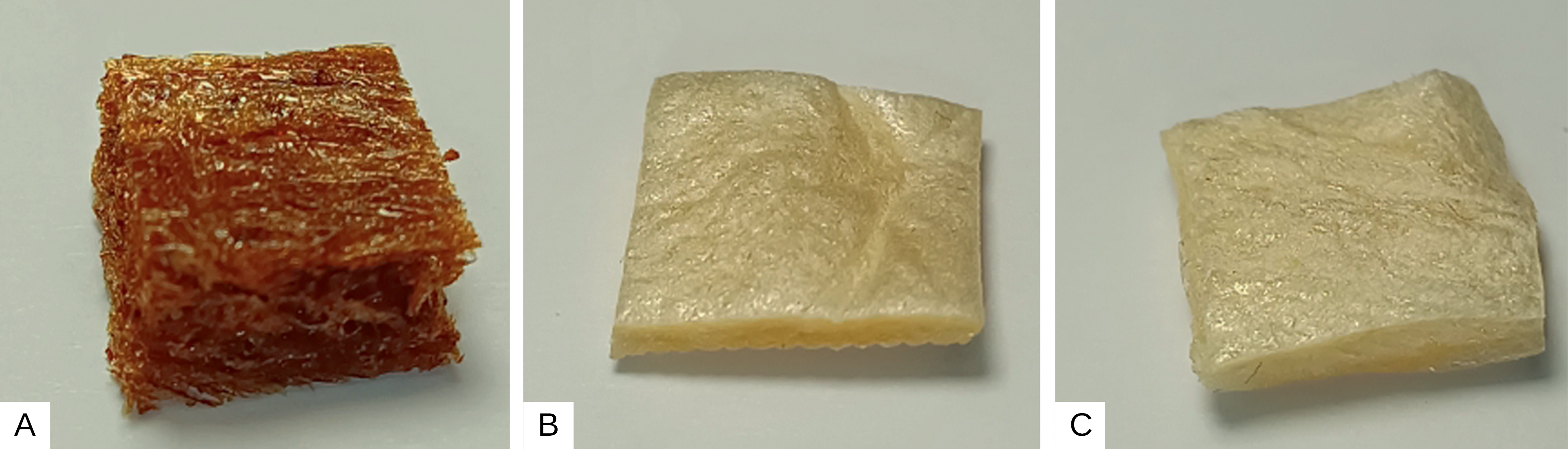 Fig. 1. Appearance of sponges made of ascorbate (A), glycolate (B) and lactate (C) chitosan size 1x1 cm2