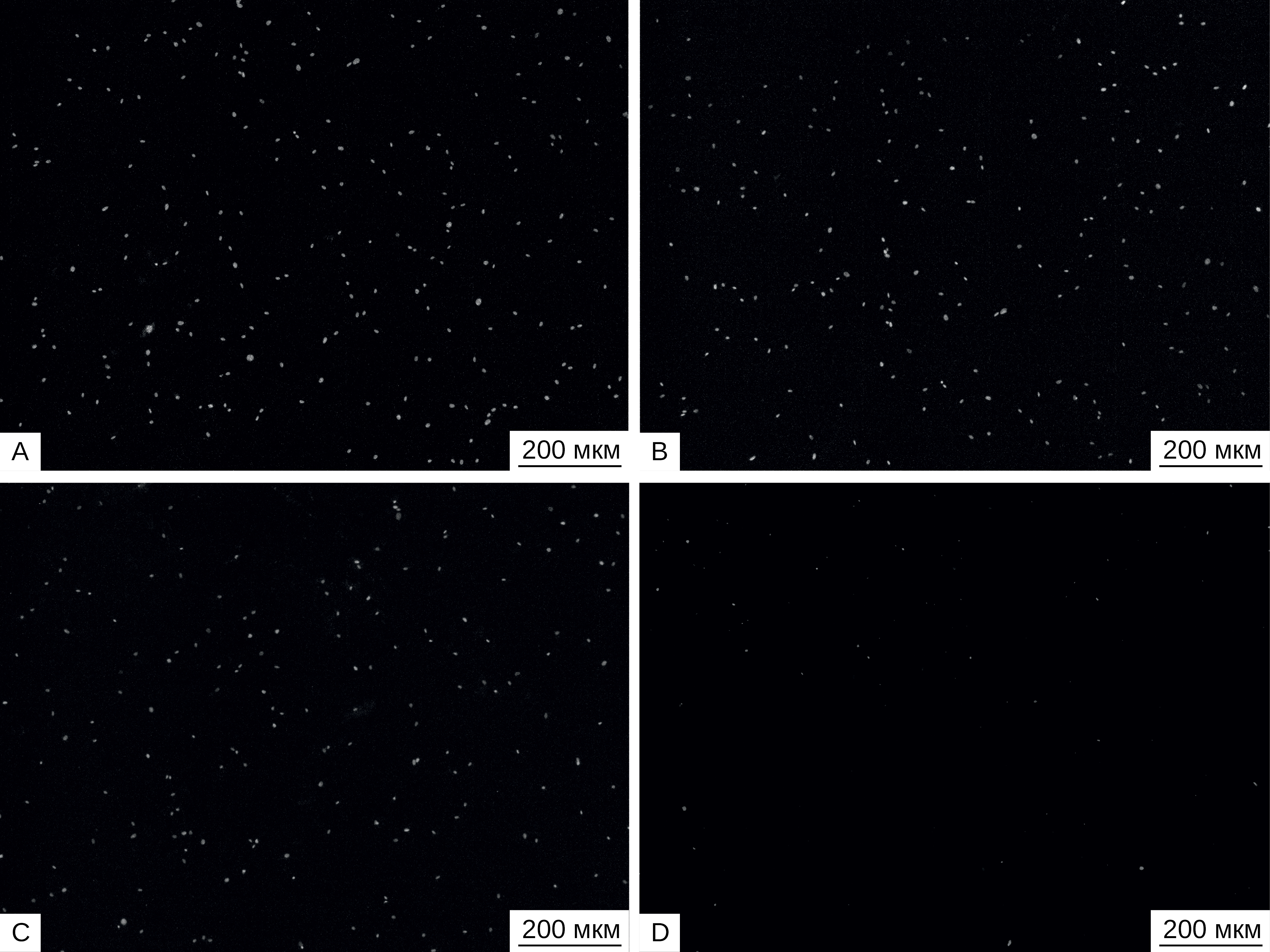 Рис. 2. Фото клеток, окрашенных DAPI, через 12 часов инкубации: A — контроль, B — гликолат хитозана, C — лактат хитозана, D — аскорбат хитозана. Шкала 200 мкм