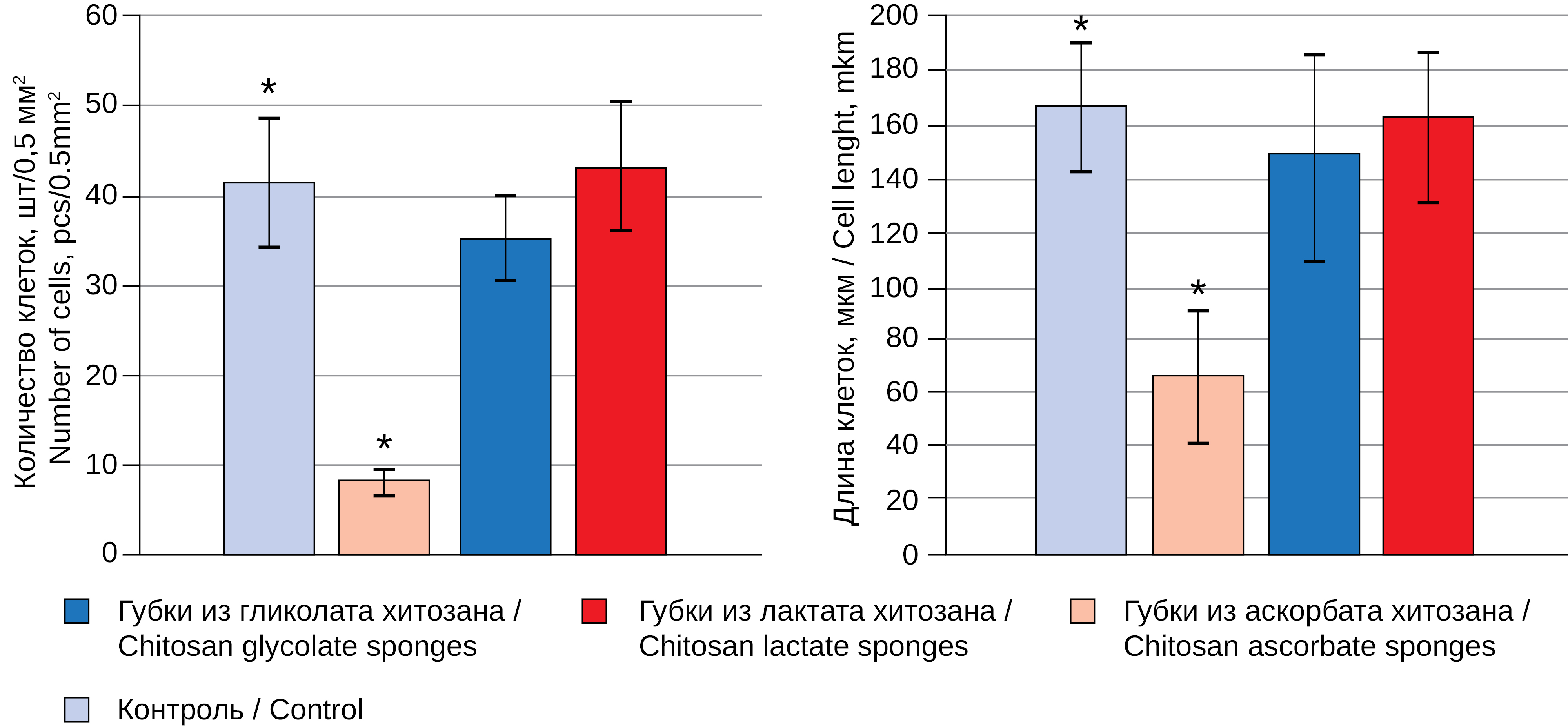 Рис. 4. Результаты микроскопии: количество клеток, адгезированных на материале в течение 12 ч (А). Длина клеток через сутки инкубации в интактной питательной среде и в средах с экспериментальными образцами (B). Данные представлены в виде среднего ± SD, n = 10, * — p < 0,05 по сравнению с количеством или длиной клеток в контроле