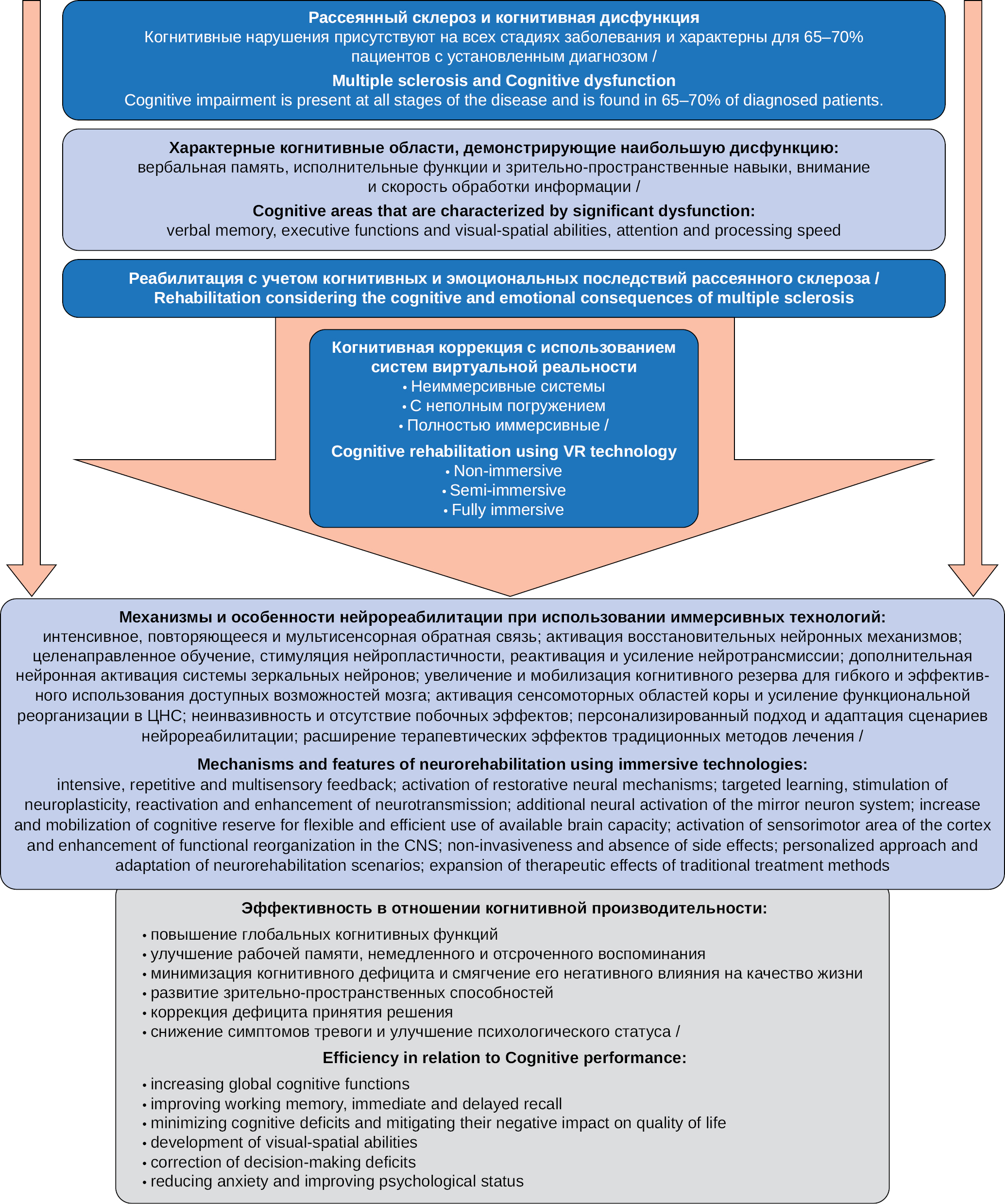 Conclusion. This review analyzes the current scientific information in this area of research, provides a detailed assessment of the current state and potential of VR technologies in cognitive rehabilitation in multiple sclerosis, and discusses the fundamental mechanisms underlying neurorehabilitation using immersive technologies.