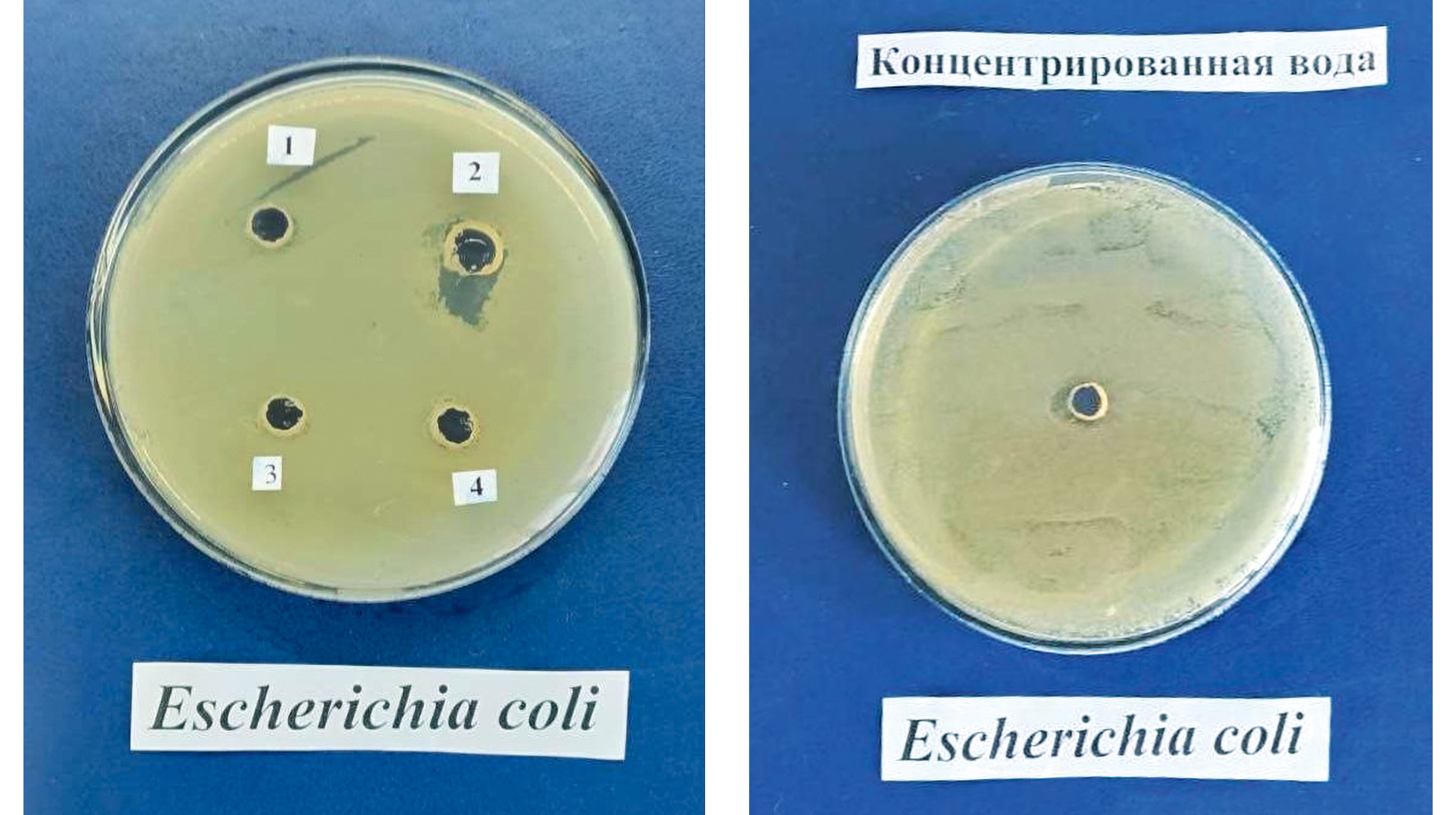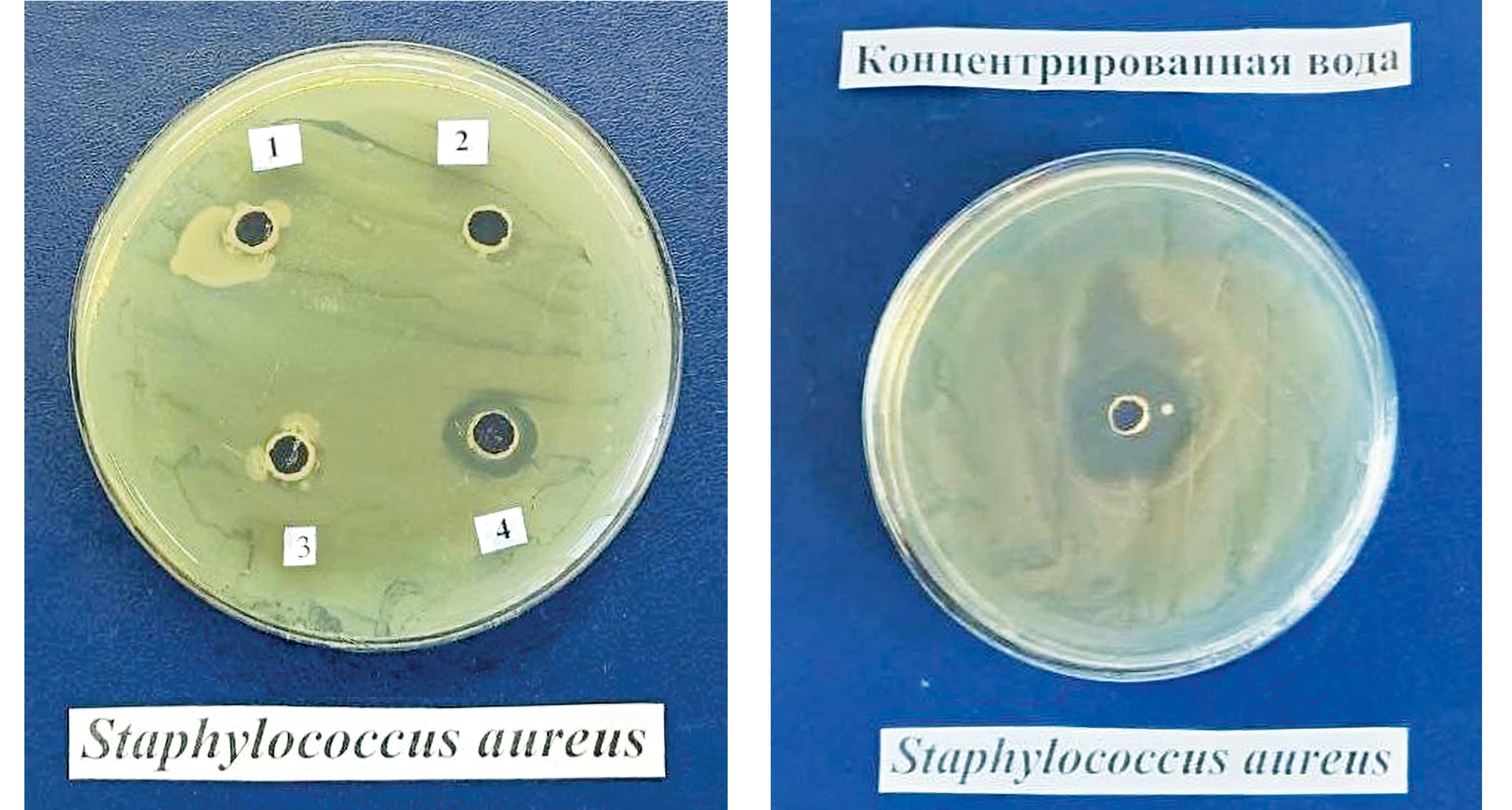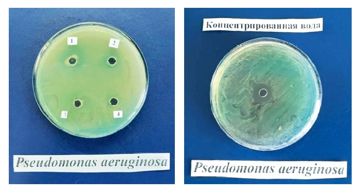 Results and discussion. Sample No. 5 (concentrated brine) showed antimicrobial activity against Staphylococcus aureus and Pseudomonas aeruginosa, the diameter of the growth inhibition zone was 22 ± 0.26 and 18 ± 0.35 mm, respectively. Also, sample No. 4 (Sanatorium Chimen DW No = 14, sulfate-sulfur mineral water) showed antimicrobial activity against Staphylococcus aureus, the diameter of the growth inhibition zone was 16 ± 0.11 mm. The samples did not show antimicrobial activity against the other test cultures. The antimicrobial action of water samples was determined by the agar diffusion method against some types of opportunistic bacteria: Escherichia coli, Pseudomonas aeruginosa, Staphylococcus aureus, Bacillus subtilis and the yeast fungus Candida albicans. All microorganism cultures were obtained from the collection of the Institute of Microbiology of the Academy of Sciences of the Republic of Uzbekistan. The determination was achieved through the use of the agar diffusion method on a dense nutrient medium.