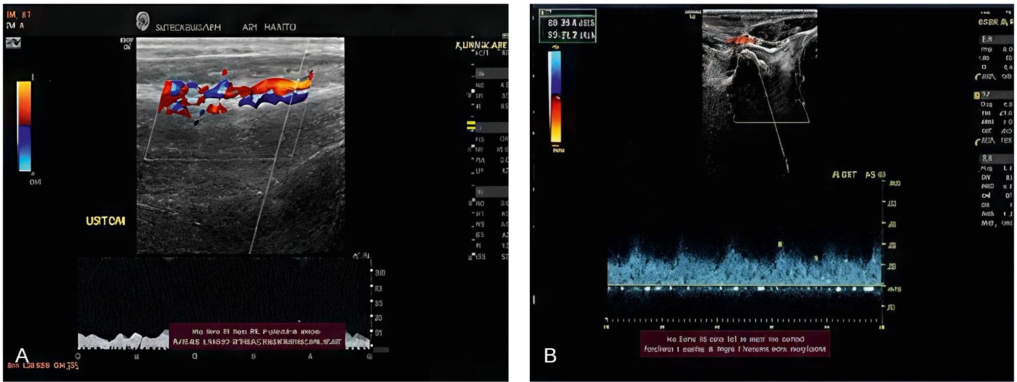 Fig. 1. A — depicts Doppler scanning of the dorsalis pedis artery in a peripheral arterial disease patient with intermittent claudication prior to intervention; B — indicates an improvement in both peak systolic velocity and acceleration time following 12 weeks of supervised treadmill training with TENS