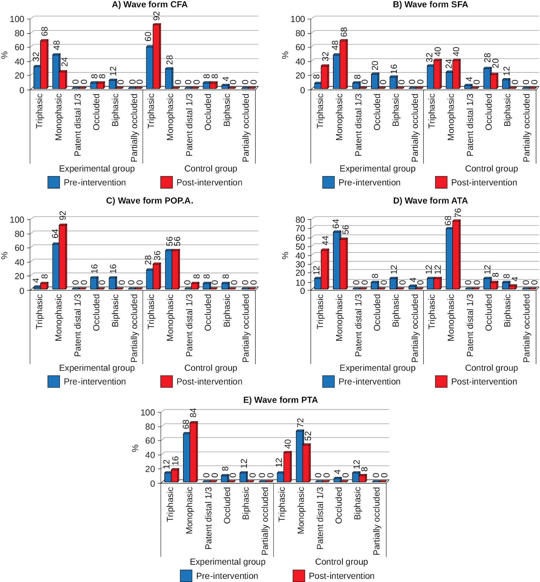 In the PTA, the experimental group had a higher frequency of patients with monophasic waveforms (17 (68.0 %), followed by 3 (12.0 %) triphasic, 3 (12.0 %) biphasic, and 2 (8.0 %) excluded pre-intervention, while 21 (84.0 %) were monophasic and 4 (16.0 %) triphasic.