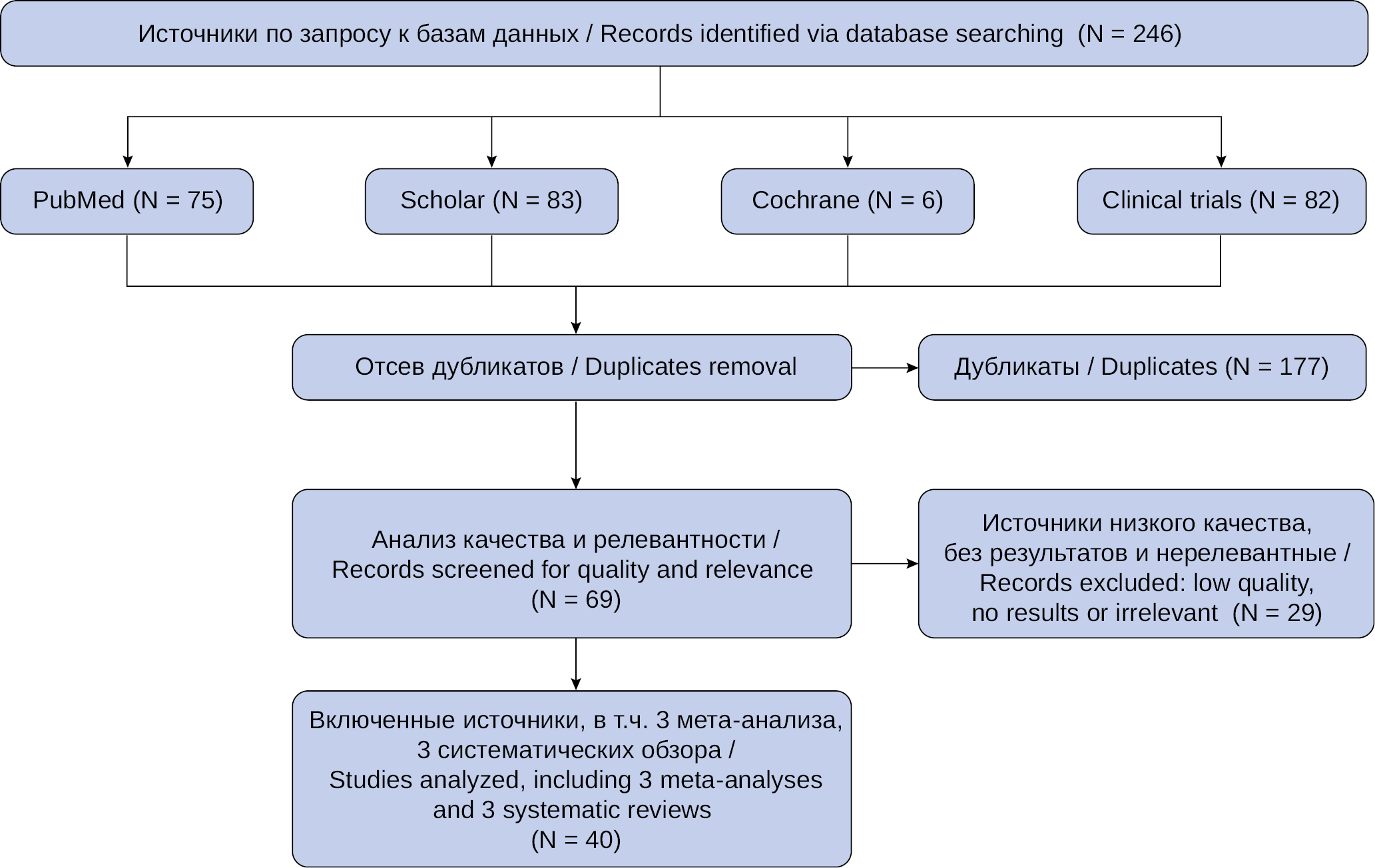 Проведен комплексный поиск публикаций в базах данных PubMed, Google Shcolar, Cochrane Library, ClinicalTrials.gov. Для анализа были выбраны данные высокого уровня доказательности (рандомизированные контролируемые исследования [РКИ], метаанализы, систематические обзоры, крупные экспериментальные исследования) за 2016–2025 гг., один источник 2013 г.
