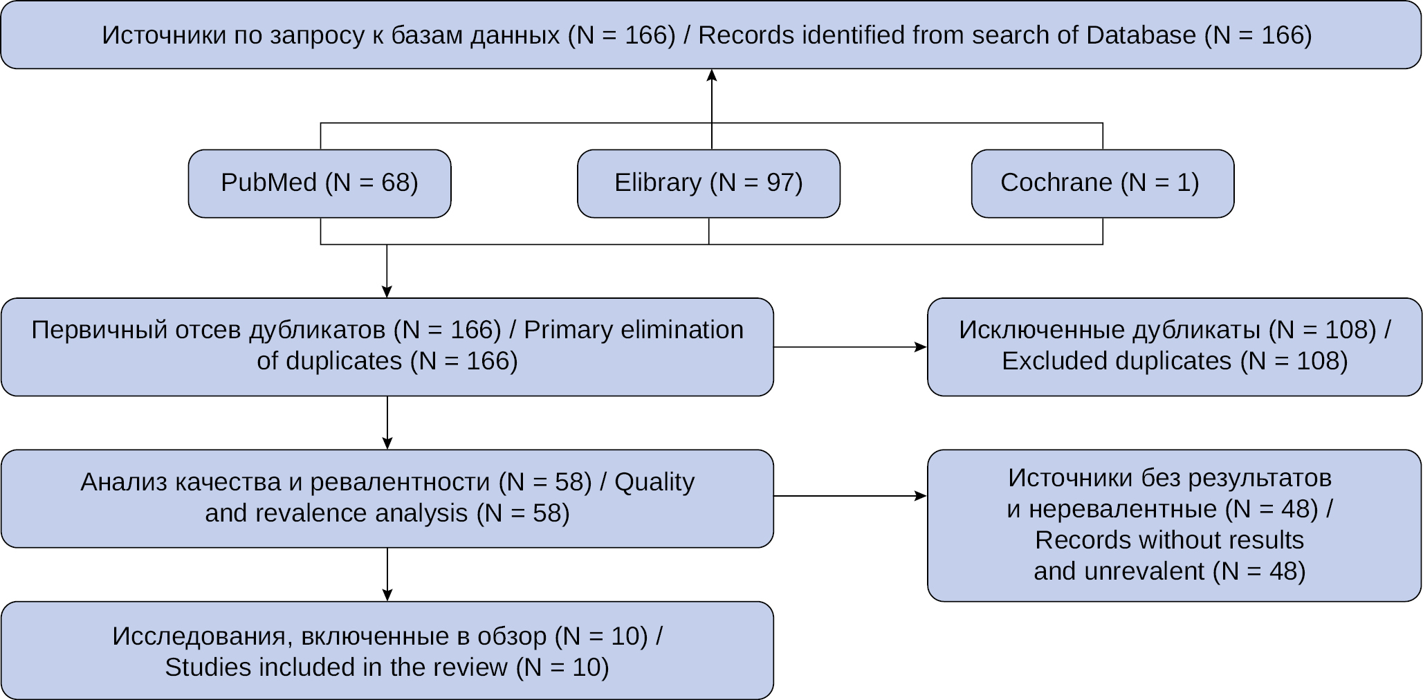 Согласно заданным параметрам поиска, найдено 166 источников. После исключения дубликатов, исследований без результатов и нерелевантных работ в анализ было включено 10 источников. Методика отбора исследований представлена на рисунке 1.