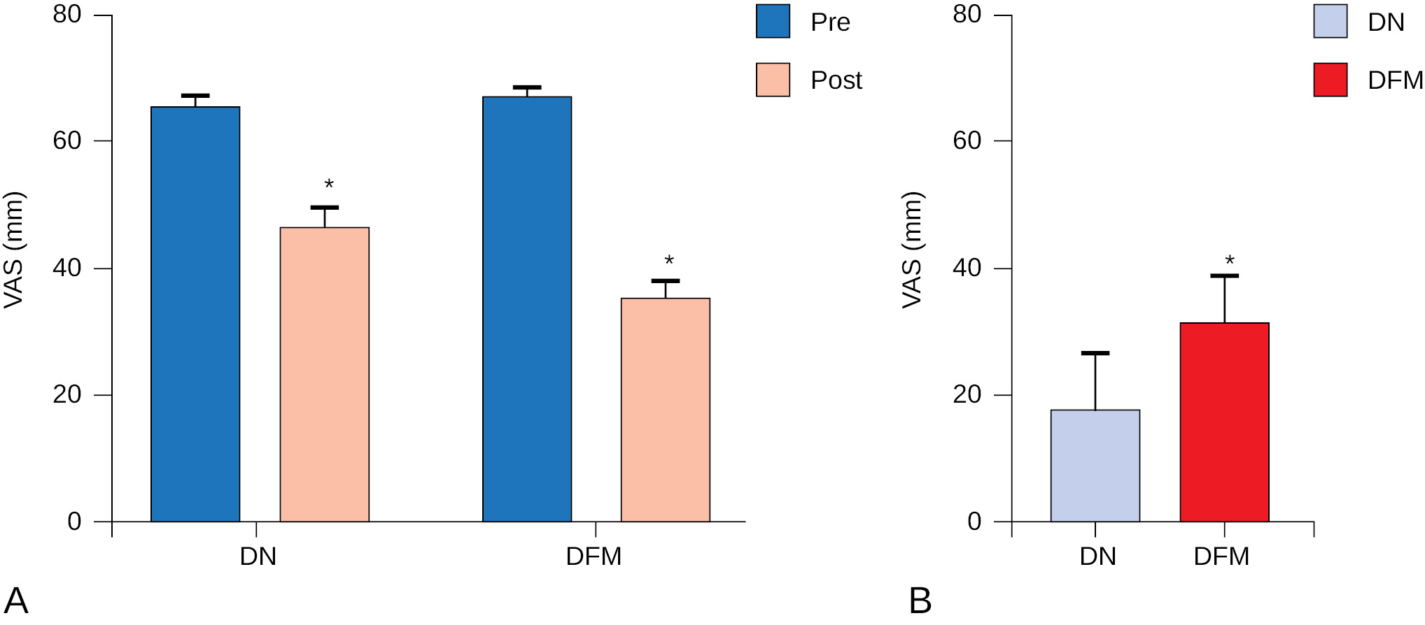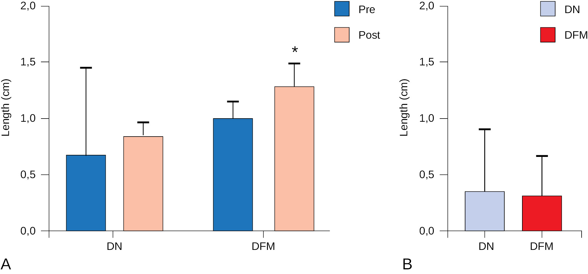 Note: A — Comparison of pre- and post-tests of DN and DFM groups; B — The Δ (delta) change represents the difference between post- and pre-intervention values (Δ = Post-Pre). The asterisk * — p > 0.05 indicates a statically significant result.