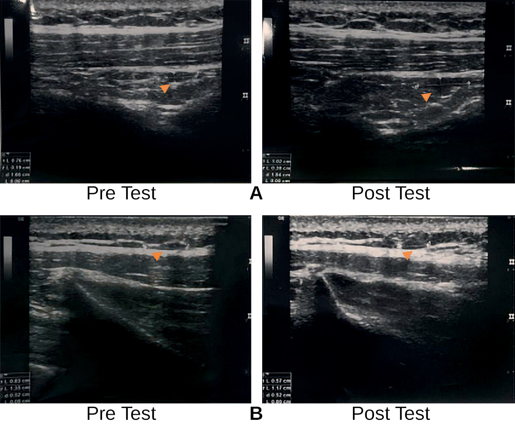Note: A — presents ultrasonographic (USG) images of the neck muscles captured before and after the dry needling (DN) intervention, showing an increase in trigger point size from 0.45 cm to 1.15 cm; B — displays USG images of the neck muscles obtained pre- and post- DN, highlighting a reduction in trigger point size from 1.01 cm to 0.93 cm.
