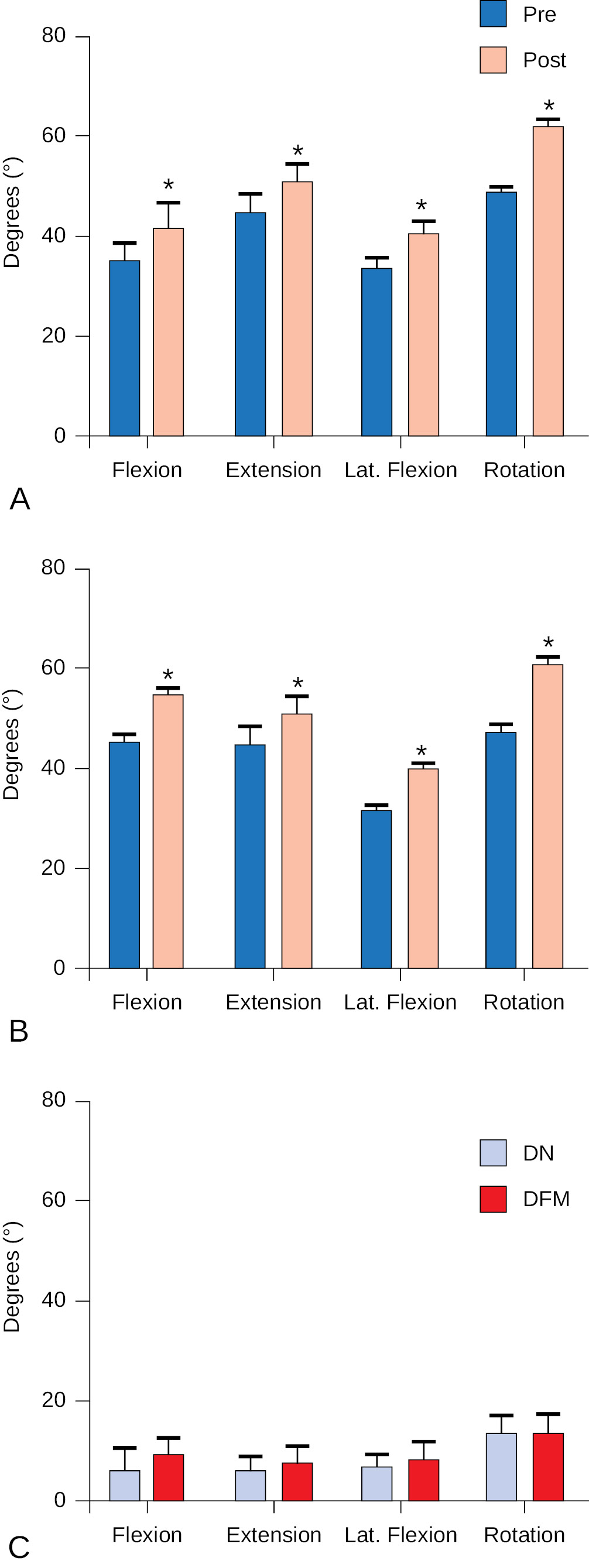 Note: A — Comparison of pre- and post-tests ROM in the DN group; B — Comparison of pre- and post-tests ROM in the DFM group; C — The Δ (delta) change represents the difference between post- and pre-intervention values (Δ = Post-Pre). The asterisk * — p < 0.05 indicates a statically significant result.