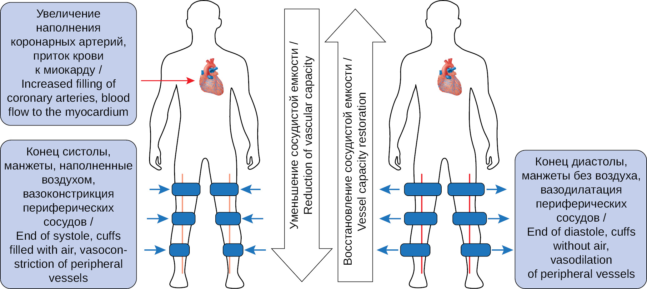 УНКП представляет собой неинвазивный метод лечения, заключающийся в улучшении гемодинамики за счет компрессии артерий нижних конечностей в период диастолы левого желудочка (ЛЖ). Метод заключается в следующем: на нижние конечности накладывают 3 манжеты с возможностью их временной компрессии. Сразу после систолы, в период ранней диастолы, последовательно в манжеты нагнетается воздух, создавая ограничения в артериях нижних конечностей в диастолу. Тем самым в период диастолического наполнения ЛЖ дополнительный объем крови, связанный с ограничением общей сосудистой емкости, доставляется в артерии миокарда. Важно отметить, что формирование усиленной контрпульсации в артериальной системе происходит не только в сердце, но и в других органах и тканях (головной мозг, органы дыхательной системы, скелетная мускулатура, почки) [7, 8]. На рисунке 1 представлено схематическое изображение механизма действия УНКП.