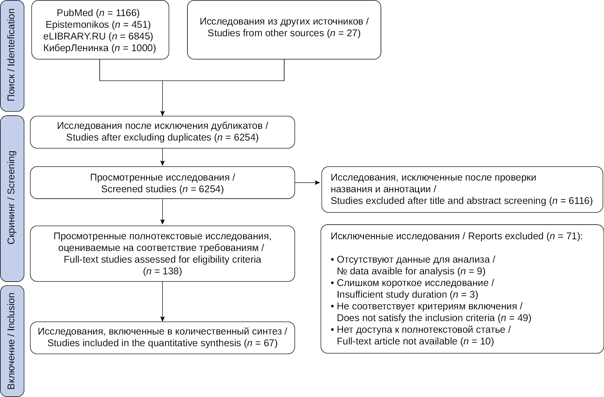 На блок-схеме PRISMA описан процесс отбора исследований (рис. 1). Поиск в базах данных выявил 9462 публикации, также были включены 27 работ, обнаруженных в списках литературы. После исключения дубликатов было рассмотрено 6254 источника. По результатам первичного скрининга было отобрано 138 исследований. Из них 12 публикаций [16–27] не были обнаружены в свободном доступе, в связи с чем на почту корреспондирующим авторам был направлен запрос с просьбой выслать искомые исследования. По истечении двух недель всего 5 авторов предоставили запрошенные статьи [18, 19, 21, 23, 25]. Кроме того, был проведен анализ 5 систематических обзоров для поиска потенциально подходящих для включения исследований [28–32].