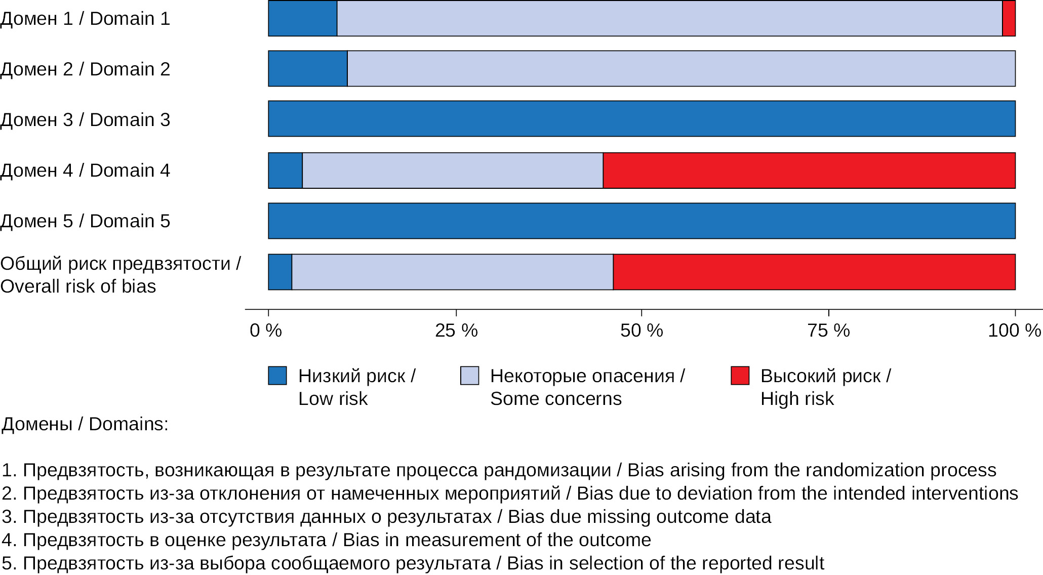 Оценка риска предвзятости производилась независимо двумя авторами (Мештель А.В., Рыбакова П.Д.) при помощи Кокрановского инструмента оценки риска систематической ошибки Risk of Bias 2 (Rob 2, 2019) [11], визуализация графиков была реализована при помощи инструмента RobVis [12]. В случае разногласий по поводу оценки какого-либо исследования третий автор (Мирошников А.Б.) повторно производил оценку, на основании которой принималось решение.
