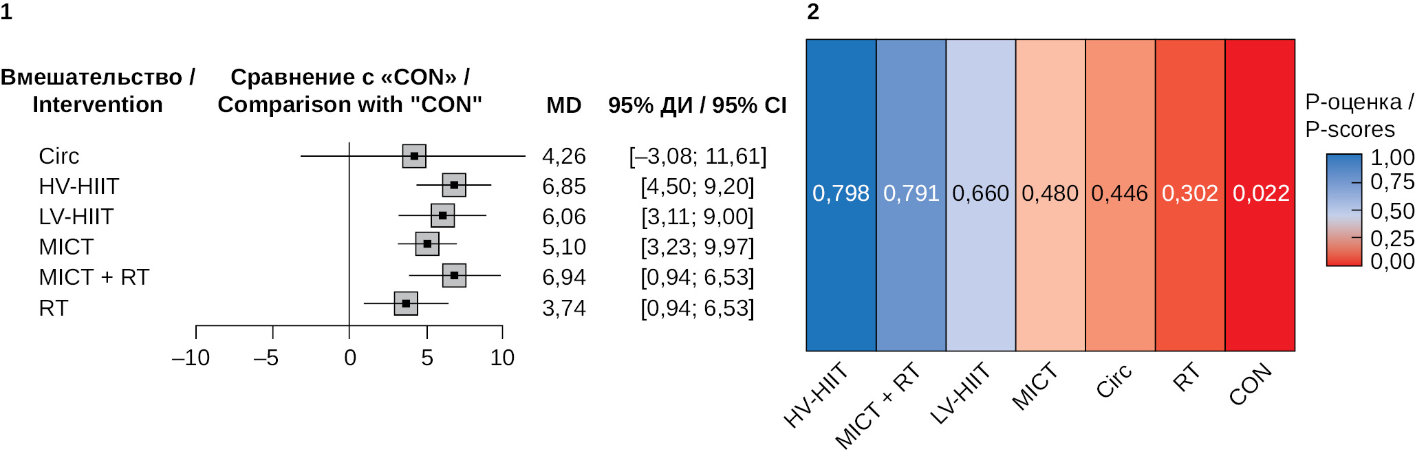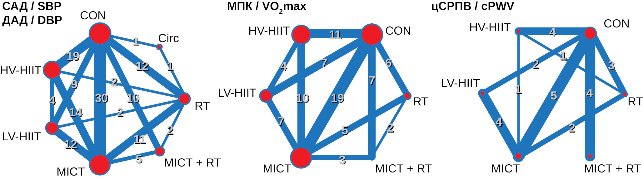 Примечание: MICT (moderate-intensity continuous training) — непрерывная тренировка умеренной интенсивности, LV-HIIT (low-volume high-intensity interval training) — высокоинтенсивная интервальная тренировка низкого объема, HV-HIIT (high-volume high-intensity interval training) — высокоинтенсивная интервальная тренировка высокого объема, Circ (circuit training) — круговая тренировка, CON (control) — контрольная группа, RT (resistance training) — тренировка с отягощениями, САД — систолическое артериальное давление, ДАД — диастолическое артериальное давление, МПК — максимальное потребление кислорода, цСРПВ — центральная скорость распространения пульсовой волны.
