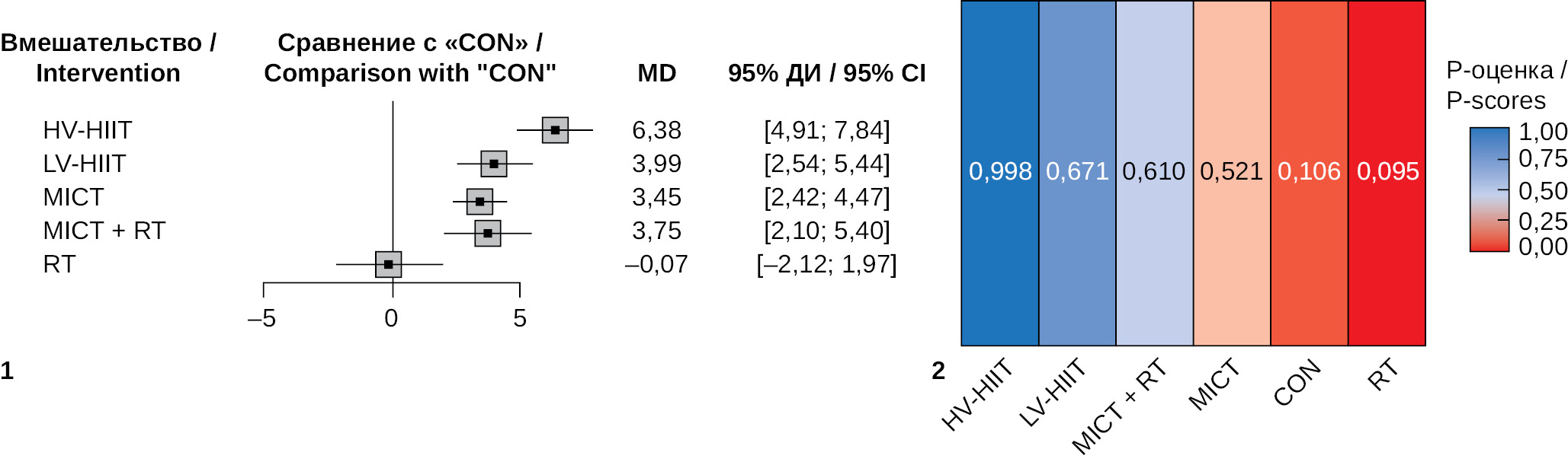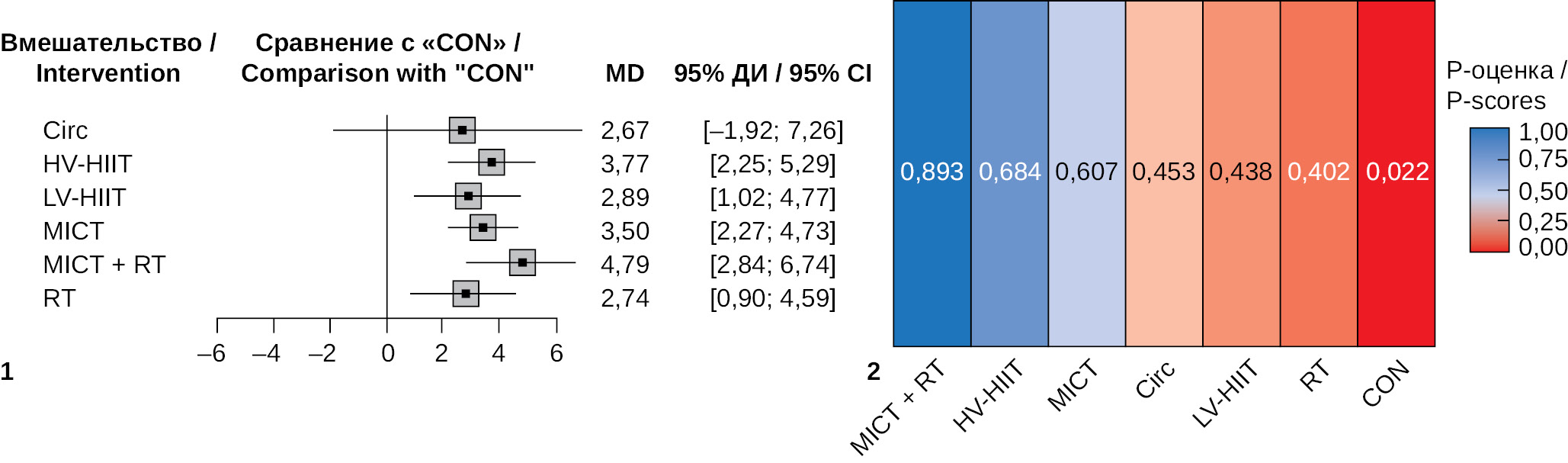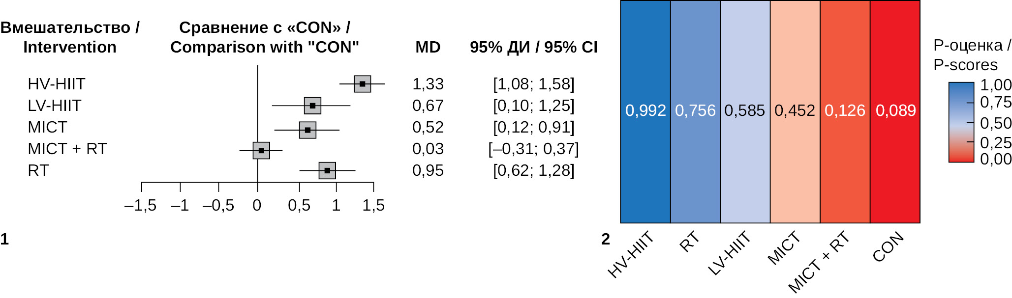 Рис. 4. Результаты попарных сравнений влияния различных протоколов тренировок и контроля на уровень систолического артериального давления (1) и результаты оценки SUCRA (2)
