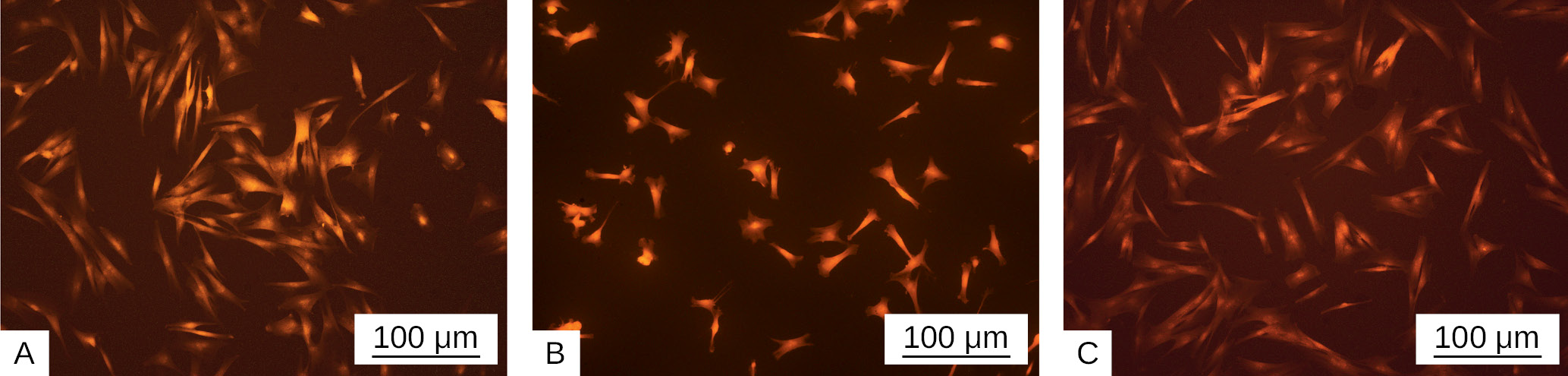 Fig. 3. Human fibroblasts after 24 hours of co-culture under standard conditions (A), and during co-culture with alginate hydrogel film — AHF (B) and alginate hydrogel film enriched with magnetite nanoparticles — AHF-MN (C); magnification ×100, scale bar 100 µm, Rhodamine staining