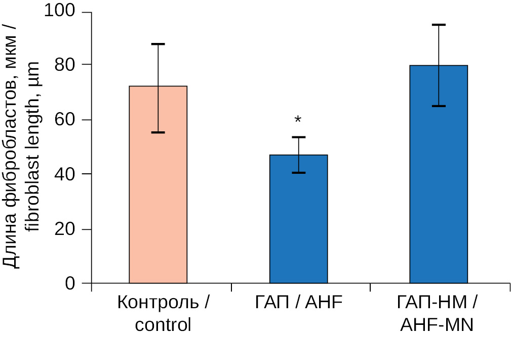 Рис. 4. Длина фибробластов человека через 24 часа совместного культивирования с альгинатными гидрогелевыми пленками — ГАП и альгинатными гидрогелевыми пленками, обогащенными наночастицами магнетита — ГАП-НМ. Данные представлены в виде среднего арифметического значения и стандартного отклонения, количество образцов в каждой группе — 7; * — по сравнению с контролем при p < 0,05.