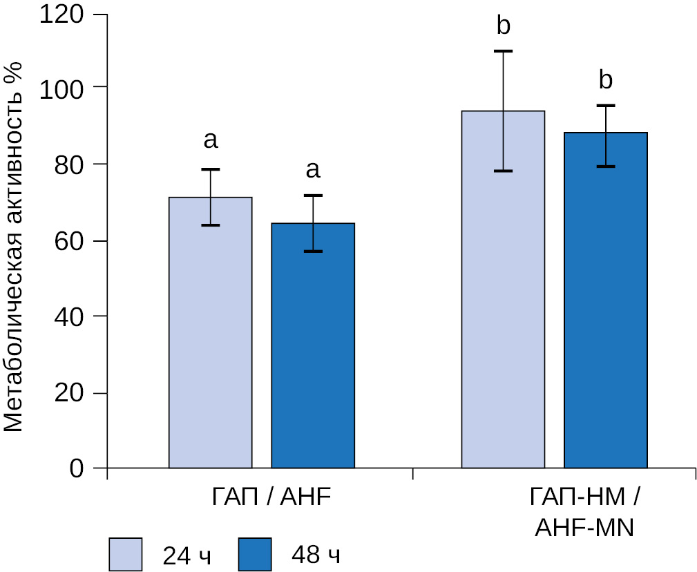 Рис. 6. Метаболическая активность фибробластов человека через 24 и 48 часов совместного культивирования альгинатными гидрогелевыми пленками — ГАП и альгинатными гидрогелевыми пленками, обогащенными наночастицами магнетита — ГАП-НМ. Данные представлены в виде среднего арифметического значения и стандартного отклонения, количество образцов в каждой группе — 7; a — по сравнению с контролем, принятым за 100 % (p < 0,05), b — по сравнению с ГАП при p < 0,05