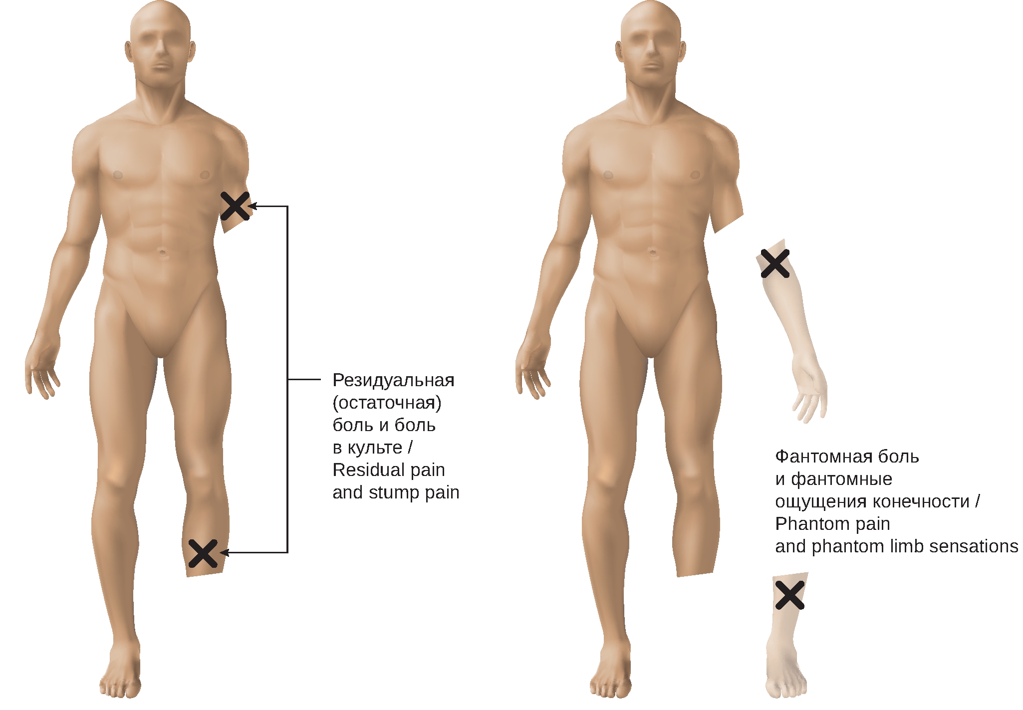 Однако необходимо учитывать, что резидуальная (остаточная) боль чаще связана с периферическими механизмами (невромы, остеофиты и др.) и возникает в ранний постампутационный период (до 3 месяцев), а фантомная боль является следствием реорганизации кортикальных карт головного мозга и отмечается в более отсроченные периоды после ампутации. Также нельзя недооценивать роль коморбидных депрессивно-тревожных расстройств, которые могут поддерживать хроническое течение постампутационного болевого синдрома [9–12].