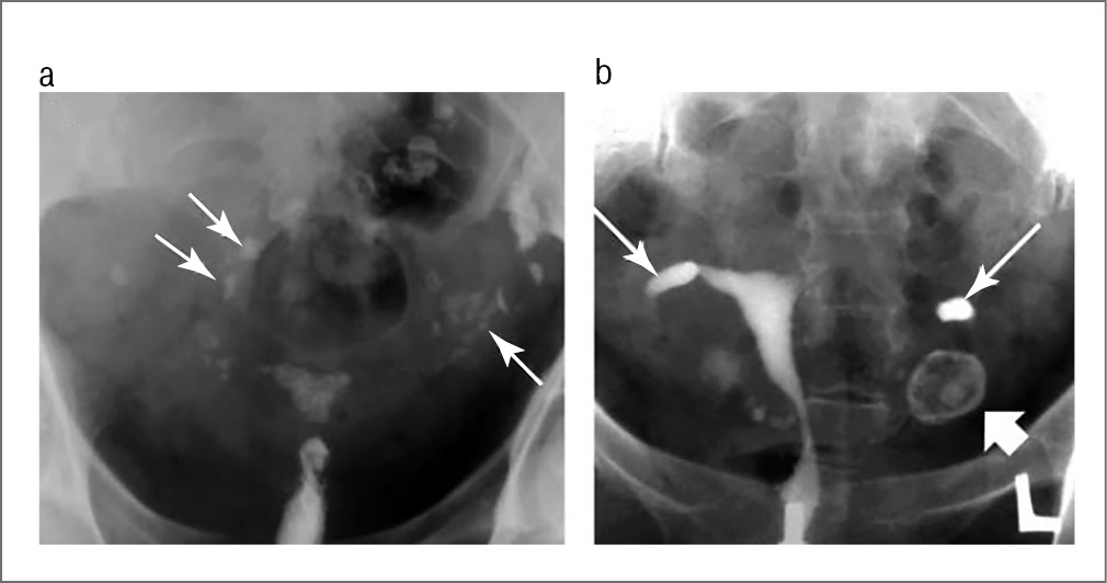Рис. 1. a. Множественные обызвествленные лимфатические узлы у больной ТЖПО. Обызвествленные лимфатические узлы в области малого таза (длинные тонкие стрелки) и по ходу фаллопиевых труб. Неравномерный контур матки, ее емкость снижена. b. Cлева видна большая тень кальцинированного яичника. Гидросальпинкс дистальной части обеих труб. Источник: F. Ahmadi и соавт. [54]. / Fig. 1. a. Multiple calcified lymph nodes in a patient with female genital tuberculosis (FGT). Calcified lymph nodes in the pelvic area (long thin arrows) and along the fallopian tubes. Irregular uterine contour; the volume of the uterine cavity is reduced. b. A large shadow of a calcified ovary can be seen on the left. Hydrosalpinx of both tubes' distal parts is observed. Source: F. Ahmadi et al. [54].