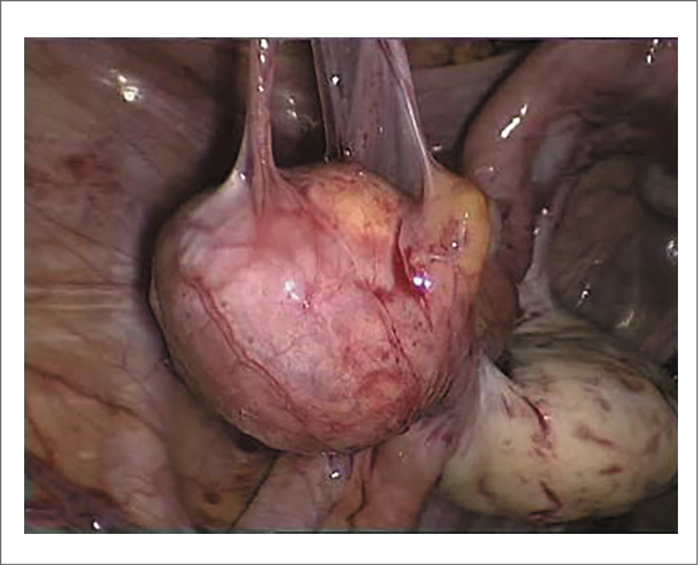Рис. 5. Туберкулема ампулярного отдела левой фаллопиевой трубы, окруженная спайками. Источник: собственное наблюдение (фото С.О. Дубровиной) [58]. / Fig. 5. Ampullary tuberculoma of the left fallopian tube enveloped by adhesions [58].