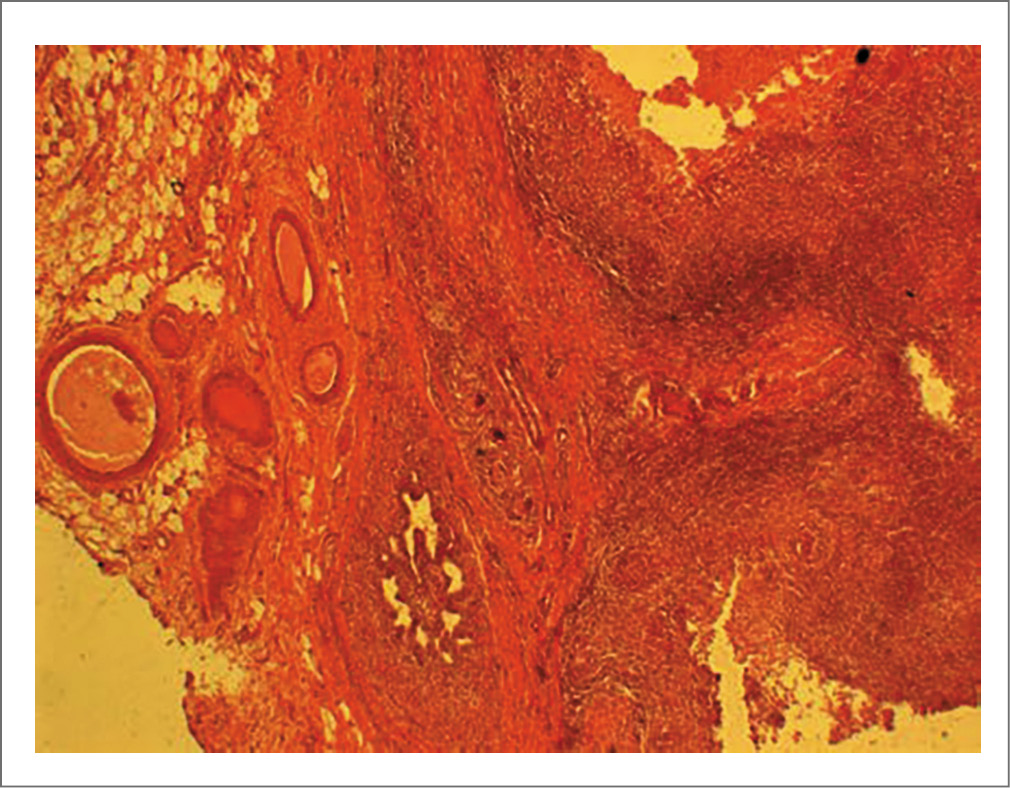 Патоморфологическое исследование операционного материала показало туберкулезное воспаление с очагами некроза, окруженное зоной фиброза (рис. 6). Важный нюанс: исследование соскоба эндометрия не продемонстрировало гистологических изменений, характерных для туберкулеза; идентифицировать патоген в соскобе также не удалось. Вместе с тем в резецированных тканях яичника методами молекулярно-генетической диагностики обнаружена МБТ.
