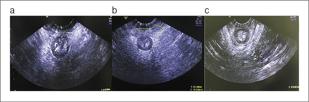 Рис. 1. Несостоятельность мышц ТД: a – уменьшение высоты сухожильного центра (D=0,52 cм); b – диастаз и истончение m. bulbocavernosus (D=1,49 cм и D=0,56 cм); c – истончение m. puborectalis (D=0,51 cм).