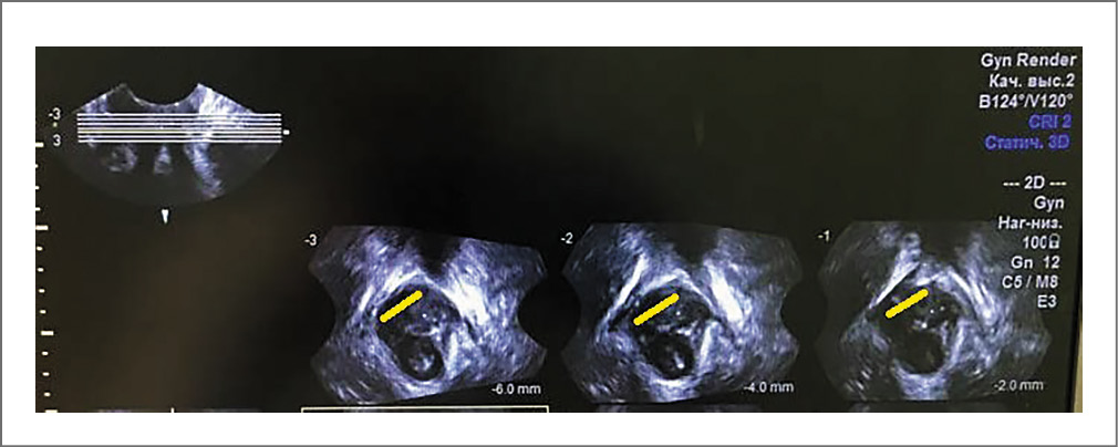 По данным трансперинеального ультразвукового исследования высота сухожильного центра промежности – 0,52 см; ширина мышечных пучков «ножек леватора» (m. bulbocavernosus) – 0,56 см; диастаз m. bulbocavernosus в области сухожильного центра – 1,49 см; толщина m. puborectalis – 0,51 см. Пролабирование передней стенки прямой кишки – нет. Энтероцеле – нет. Пролабирование шейки матки – нет. Пролабирование задней стенки мочевого пузыря – есть, ниже лонного сочленения и имеет форму остроугольного треугольника.