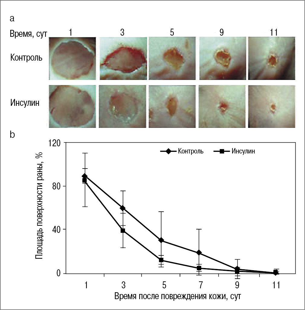 В процессе заживления ран и ожогов инсулин стимулирует клеточную миграцию в очаг поражения [6]. Он также улучшает заживление ран, поддерживая выживание кератиноцитов [7], регулируя воспалительные реакции (снижая, в частности, количество и активность макрофагов) [8], резистентность к сепсису [9] и увеличивая синтез белка в области повреждения кожи [10].