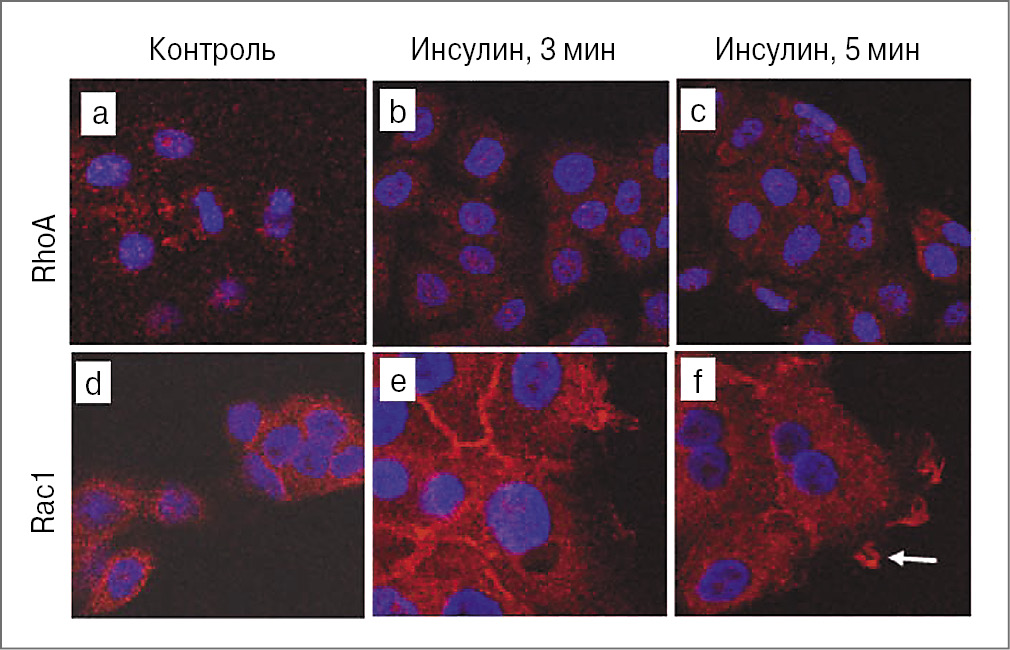 Заметим, что упоминаемое ранее воздействие топического применения инсулина на ранозаживление связано, в частности, с поддержкой выживания и миграции кератиноцитов [7]. Инсулин стимулирует сигнальный белок Rac1 посредством описанного выше МИ-зависимого каскада PI3K/Akt (рис. 3).