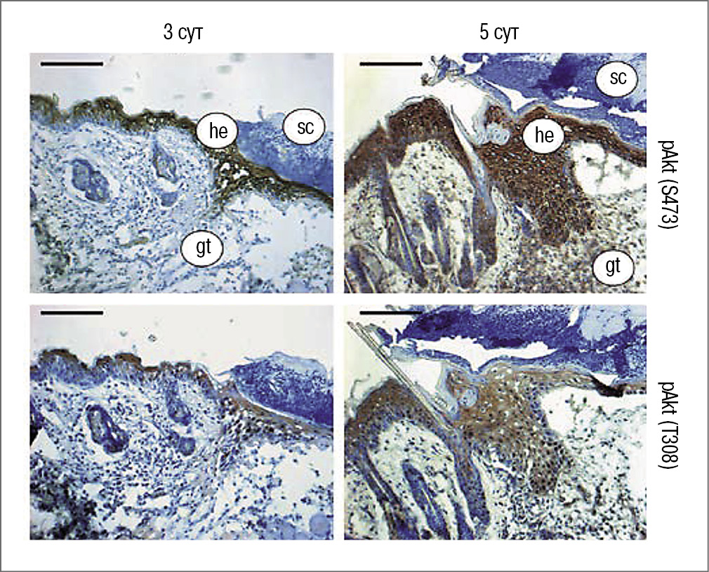 Рис. 4. Локализация активной формы Akt-киназы в регенерирующей коже. Показаны две основные фосфорилированные (т.е. активированные посредством МИ) формы киназы: pAkt(Ser-473) и pAkt(Thr-308). Окрашивание антителами, масштабная планка 50 мм. Обозначению «gt» соответствует грануляционная ткань; «he» – гиперпролиферирующий эпителий; «sc» – поверхностный струп. / Fig. 4. Localization of the active form of AKT kinase in regenerating skin. Two major phosphorylated (i.e. activated by MI) forms of kinase: pAkt(Ser-473) and pAkt(Thr-308). Antibody staining, scale bar 50 mm; gt – granulation tissue; he – hyperproliferative epithelium; sc – superficial crust.