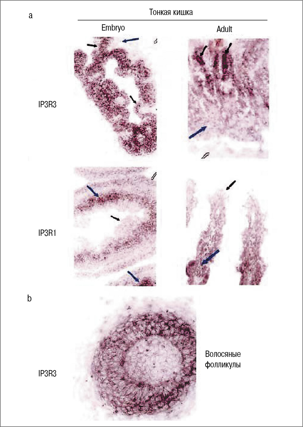 Рис. 8. Повышение экспрессии рецептора IP3R3 в быстро обновляющихся тканях: a – окрашивание IP3R3 в клетках эпителия тонкого кишечника. Черные стрелки указывают на окрашивание IP3R3, синие – на отсутствие окрашивания IP3R3; b – окрашивание IP3R3 хорошо заметно в волосяном фолликуле. / Fig. 8. Upregulation of the IP3R3 receptor in rapidly renewing tissues: a – IP3R3 staining in small intestine epithelial cells. Black arrows indicate IP3R3 staining; blue arrows indicate no IP3R3 staining; b – IP3R3 staining is clearly visible in the hair follicle.