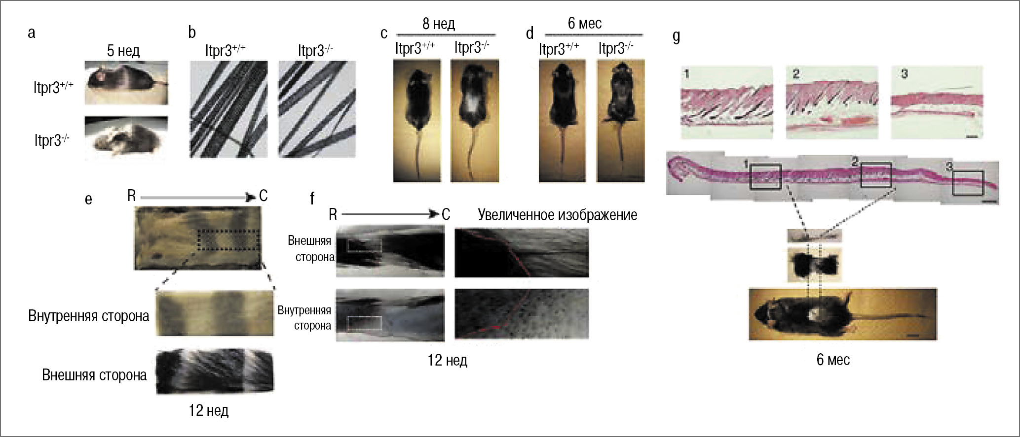 Рис. 9. Нарушения цикла волос при экспериментальной делеции гена Itpr3: a – вид сбоку, 5 нед; b – морфология волос (планка 50 мм), при делеции – более рыхлые волокна; c, d – вид со спины, 8 нед и 6 мес; е – нарушения структуры кожи, С – со стороны хвоста, R – со стороны черепа; f – внешняя и внутренняя стороны кожи при делеции Itpr3-/-, красная линия указывает на границу области алопеции; g – окрашивание гематоксилином-эозином сагиттальной секции кожи спины при делеции Itpr3-/-. / Fig. 9. Hair cycle abnormalities in experimental deletion of the Itpr3 gene: a – side view, 5 weeks; b – hair morphology (bar 50 mm), more loose fibers in case of deletion; c, d – dorsal view, 8 weeks and 6 months; e – skin structure abnormalities, C – tail side, R – skull side; f – outer and inner sides of the skin in the Itpr3-/- deletion, with the red line indicating the boundary of the alopecia area; g – hematoxylin-eosin staining of the sagittal section of the dorsal skin at Itpr3-/- deletion.