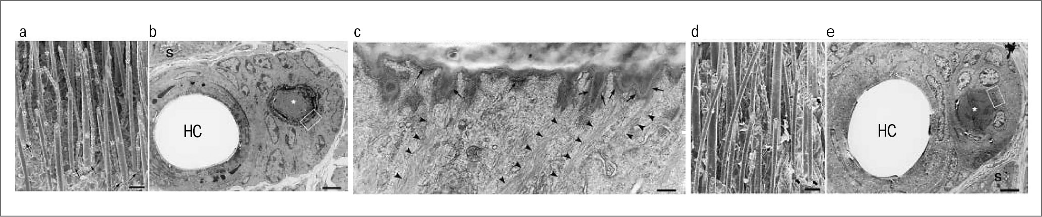 Рис. 10. Нарушения цитоскелета при делеции гена Itpr3 в волосяных фолликулах: а – корневые части многих волос в фазе телогена охвачены кутикулой с «зазубренностями» (звездочки) и смешиваются с более толстыми анагеновыми волосами, покрытыми гладкой кутикулой; b – нормальный волосяной фолликул, * – волос, S – сальные железы; c – тонкие корни волос встречаются довольно редко (звездочки), волосяные каналы заняты одиночными волосами в фазе анагена (толстые стрелки) или смешанными волосами в фазах анагена и телогена (тонкие стрелки); d – расслоение кератина (стрелки) при делеции; е – волосяной фолликул при делеции гена. / Fig. 10. Cytoskeletal abnormalities in the Itpr3 gene deletion in hair follicles: a – the root parts of many hairs in the telogen phase are covered by a serrated cuticle (asterisks) and are mixed with thicker anagen hairs covered by a smooth cuticle; b – normal hair follicle, * – hair, S – sebaceous glands; c – thin hair roots are quite rare (asterisks), hair channels are occupied by single hairs in anagen phase (thick arrows) or mixed hairs in anagen and telogen phases (thin arrows); d – keratin foliating (arrows) in gene deletion; e – hair follicle in gene deletion.