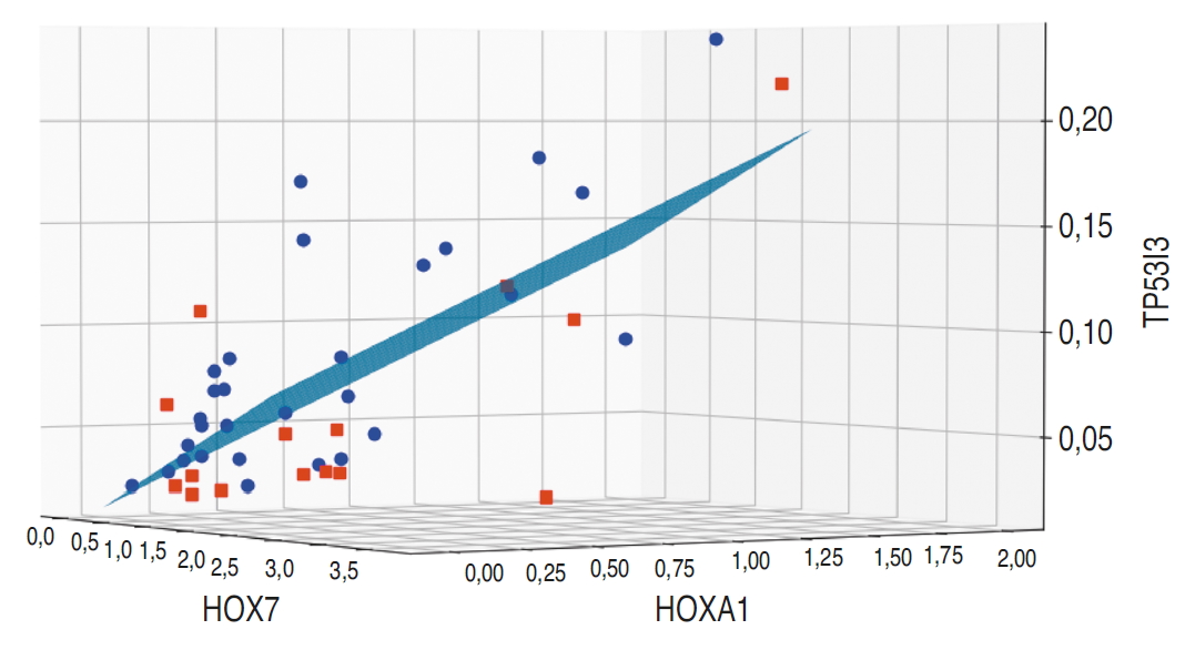 Рис. 2. Наилучшая плоскость, полученная с использованием метода опорных векторов для классификатора на основе генов MSX1 (HOX7), HOXA11 и TP53I3.