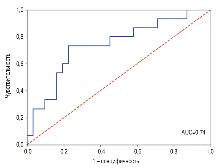 Для тройки генов MSX1, HOXA11, TP53I3 чувствительность классификатора составила 73%, специфичность – 71%, а площадь под ROC-кривой (AUC) – 0,738 (95% доверительный интервал 0,577–0,898). Прогностическая ценность отрицательного результата составила 84,6%, а положительного – 55,0%. Полученная ROC-кривая представлена на рис. 3, а диаграмма, отражающая распределение значений классификатора в 2 группах, – на рис. 4.