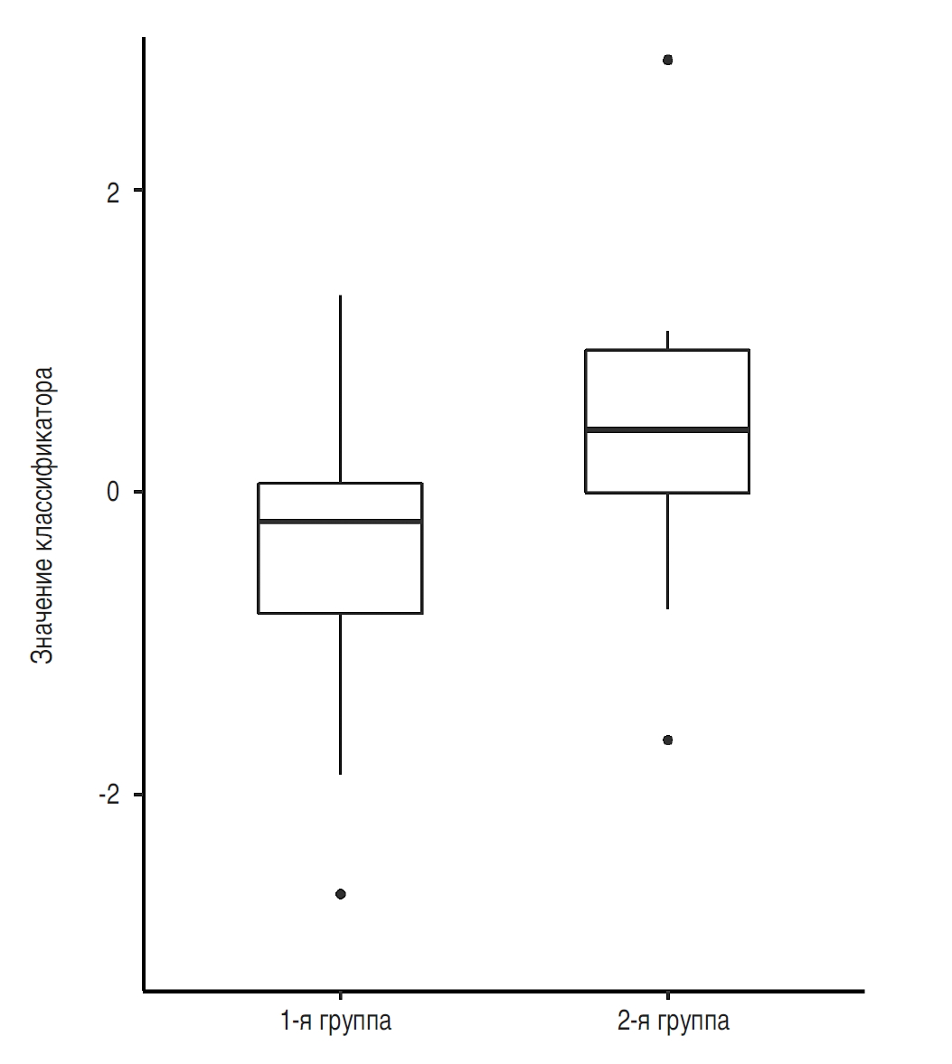 Рис. 4. Диаграмма размаха («ящик с усами»), отражающая распределение значений классификатора, построенного на основе генов MSX1, HOXA11 и TP53I3. Жирной горизонтальной линией обозначена медиана, края «ящика» обозначают верхний и нижний квартиль, «усы» отражают наблюдаемый максимум и минимум, а точки означают выбросы.