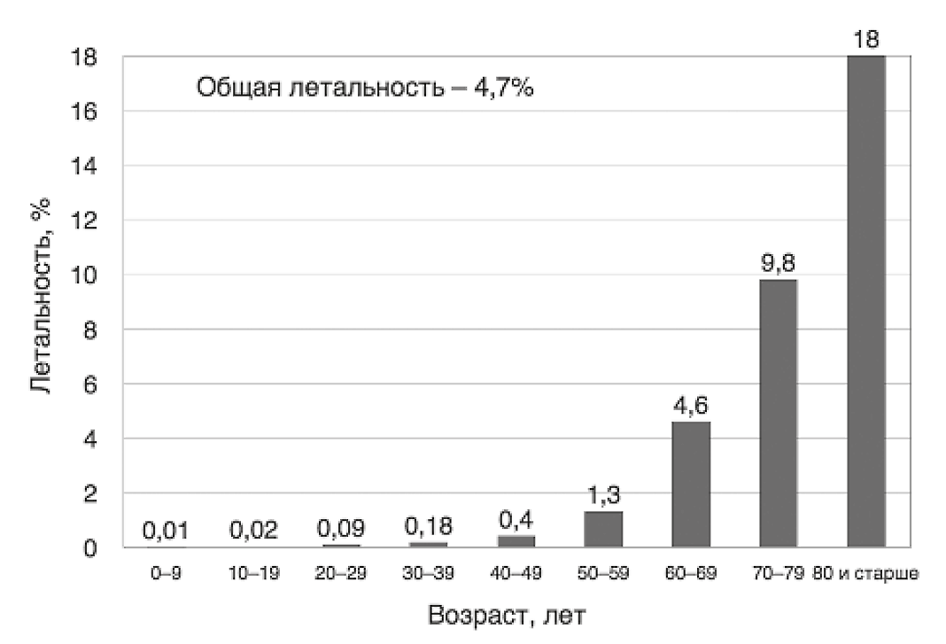 Рис. 4. Летальность от коронавирусной инфекции в зависимости от возраста (по данным из КНР).