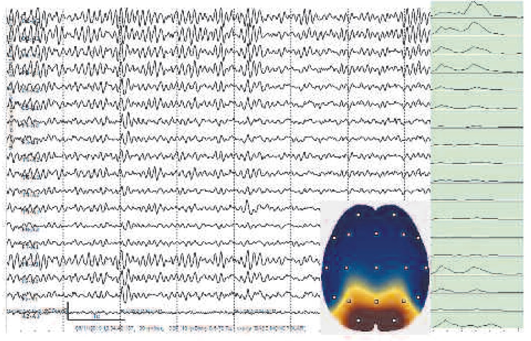 По данным экспертного ЭЭГ-анализа, у всех пациенток наблюдали диффузные нарушения биоэлектрической активности головного мозга: от легкой степени до явно выраженной. У 6 пациенток отметили изменение биоэлектрической активности головного мозга нейродегенеративного характера по типу антеризации. Оно выражалось в нарушении градиента a-ритма: постепенном смещении источника активности a-ритма от затылочного отведения к лобным с преобладанием в последних (рис. 1), усилении диффузной медленно-волновой активности в ЭЭГ и постепенном преобладании медленно-волновой активности в фоновой ЭЭГ.