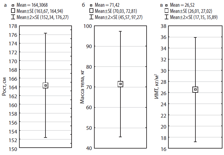 Рис. 1. Средние значения росто-весовых показателей и ИМТ у пациенток со СЛВ.