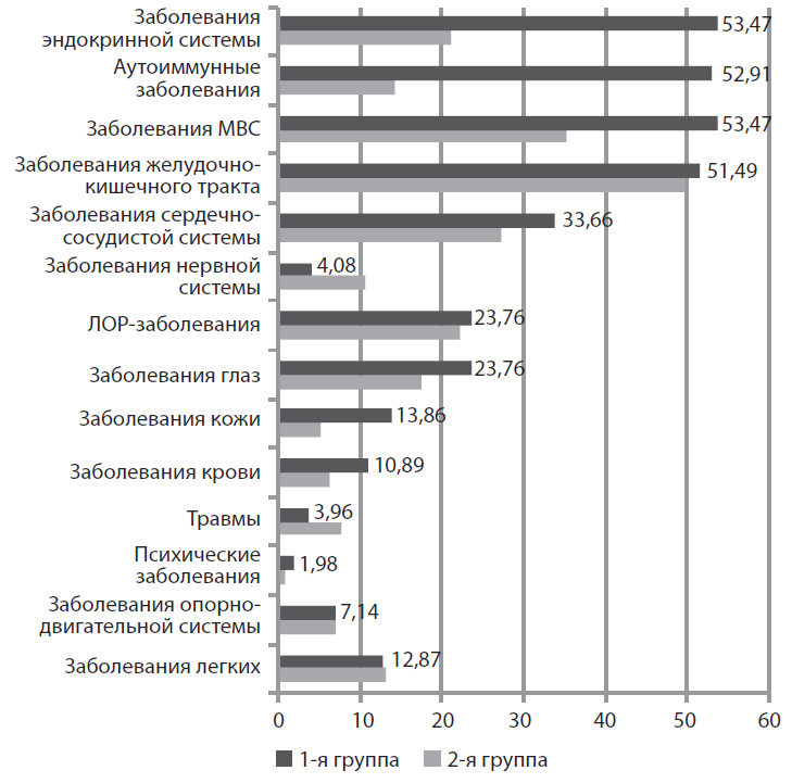Рис. 2. Структура перенесенных экстрагенитальных заболеваний у 1-й (СЛВ) и 2-й группы (контрольной).