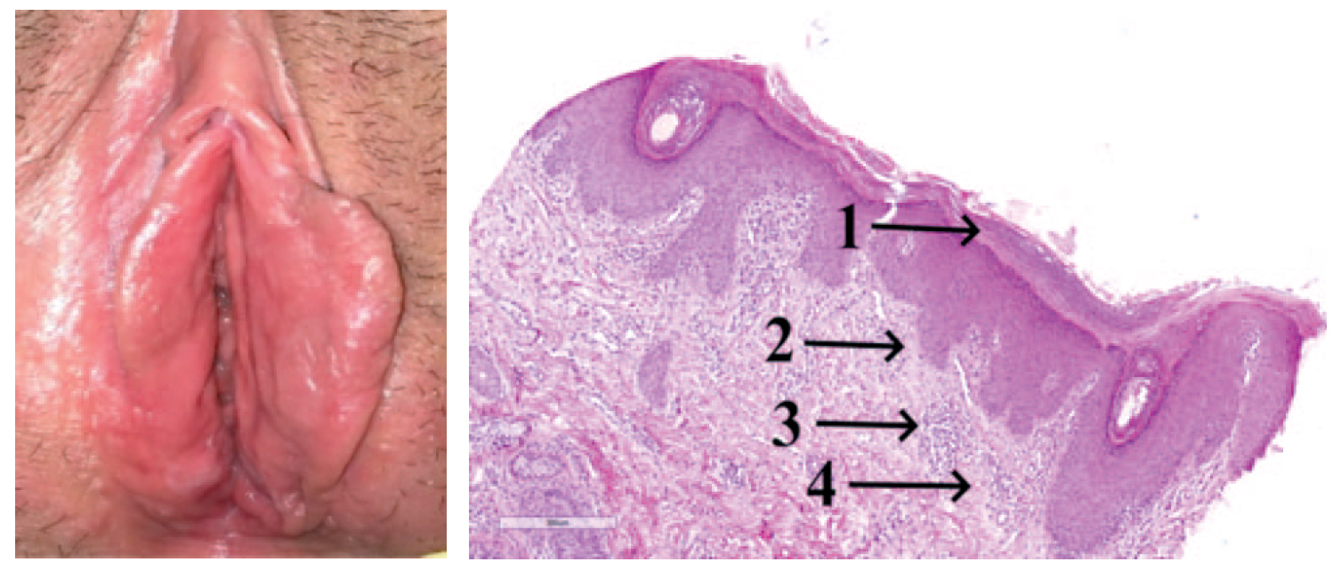 Длительность заболевания – 4 года. Справа фрагмент кожи вульвы с морфологическими признаками СЛ: 1 – гиперкератоз эпидермиса; 2 – глубокий акантоз; 3 – очаговая воспалительная инфильтрация; 4 – фиброз в сосочковом слое дермы. Окраска гематоксилином и эозином. Объектив 4×. Окуляр 10×.