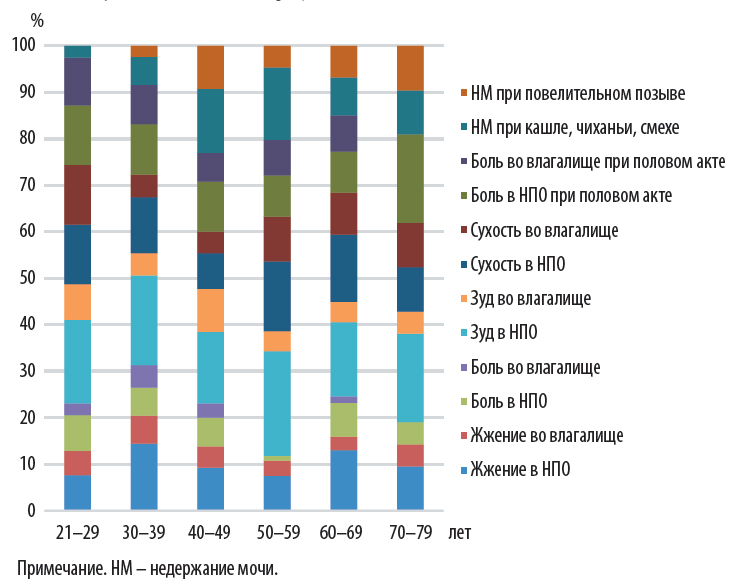 Мы провели анкетирование пациенток по валидированной визуальной аналоговой шкале, согласно которой у большинства наблюдалось сочетание различных симптомов, среди которых статистически значимо (p<0,001) преобладали: зуд НПО (79%), сухость (55%), жжение (47%), диспареуния (43%) и болезненность в НПО (24%). Бессимптомное течение заболевания фиксировалось в 11% случаев (рис. 3).