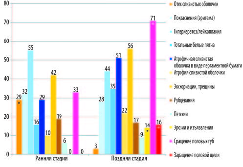 Среди элементов СЛ НПО у женщин на ранней стадии чаще отмечались гиперкератоз/лейкоплакия (55%), отек слизистых (29%; p<0,001), на поздней стадии имелись участки в виде пергаментной бумаги (51%), эрозии (14%; p=0,03), сращение половых губ (71%; p<0,001) и сужение входа во влагалище (16%; p=0,03). Клинические признаки СЛВ НПО у пациенток со СЛВ указаны на рис. 5.