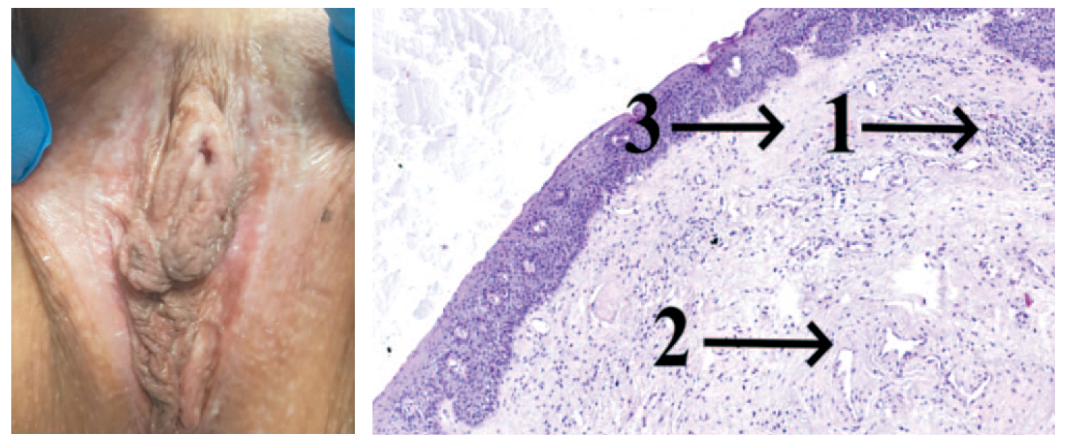 Справа – фрагмент кожи вульвы с ранней стадией СЛ: 1 – слабая воспалительная инфильтрация; 2 – расширенные капилляры; 3 – фиброз в сосочковом слое дермы. Окраска гематоксилином и эозином. Объектив 4×. Окуляр 10×.
